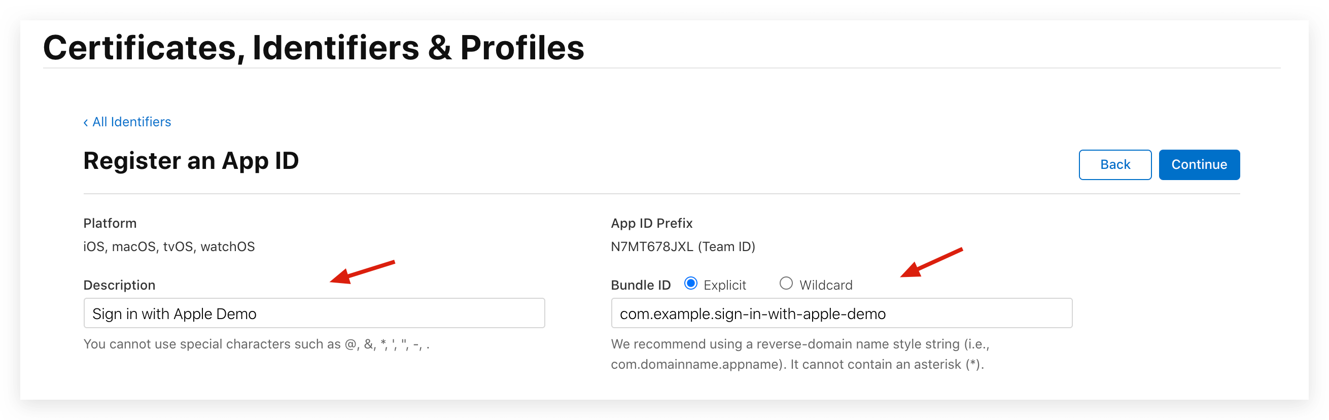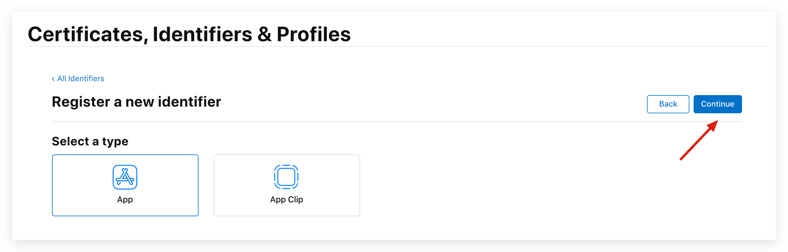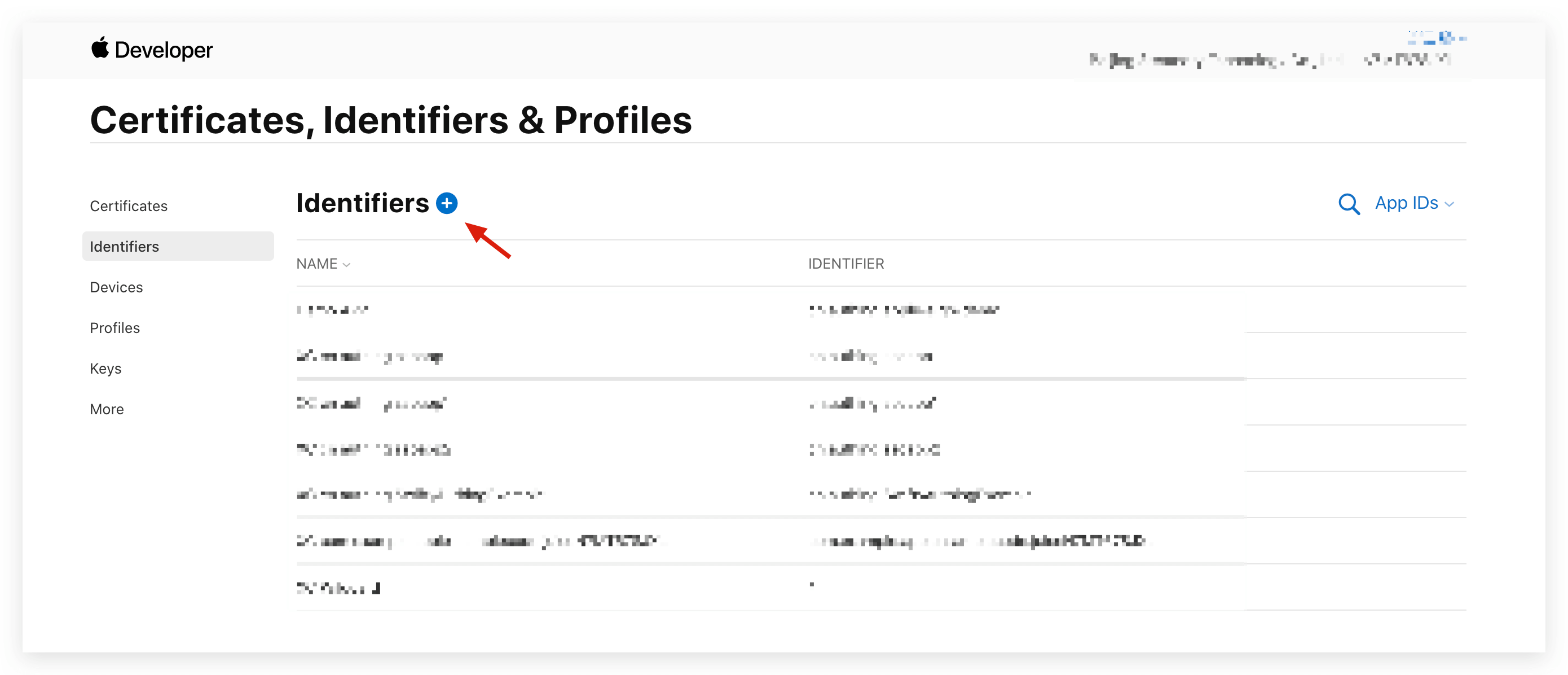 - In the Apple Developer Portal, Certificates, IDs, & Profiles > Identifiers page, click the ➕ icon to create an app: