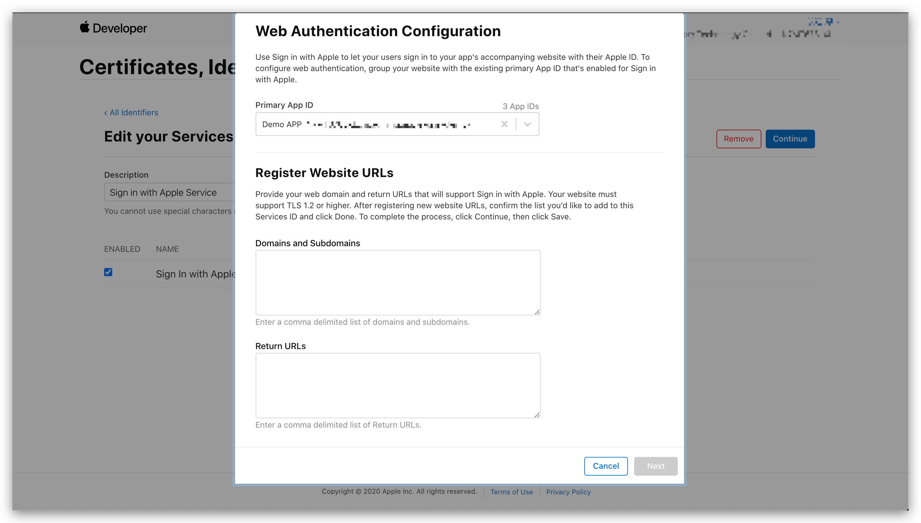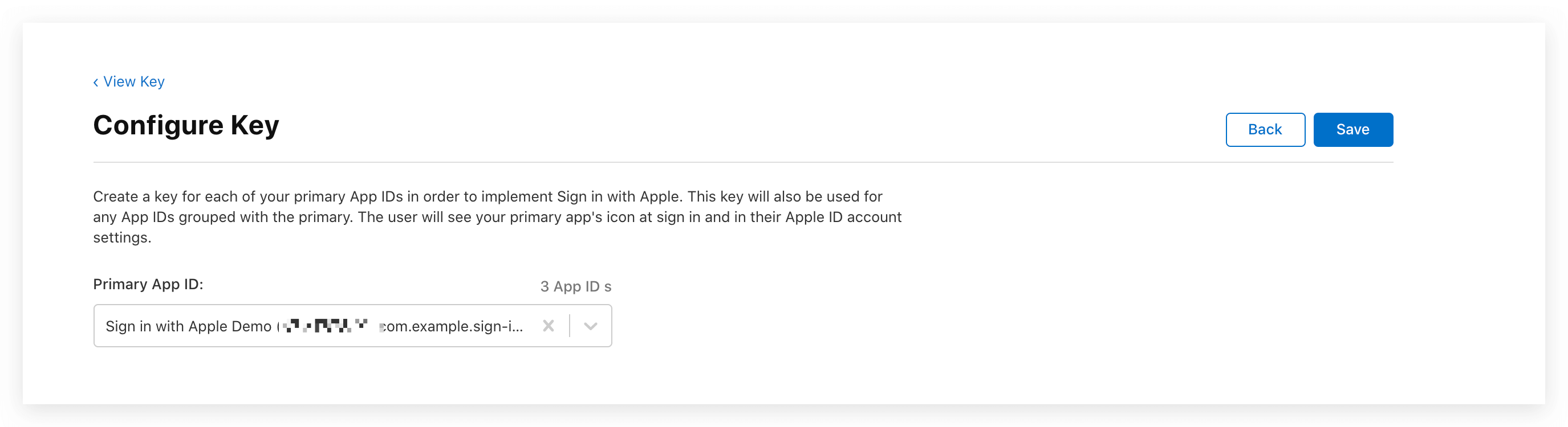 - Enter a name and check Sign in with Apple, click Configure, and make sure the Primary App ID selected is the one you just created: