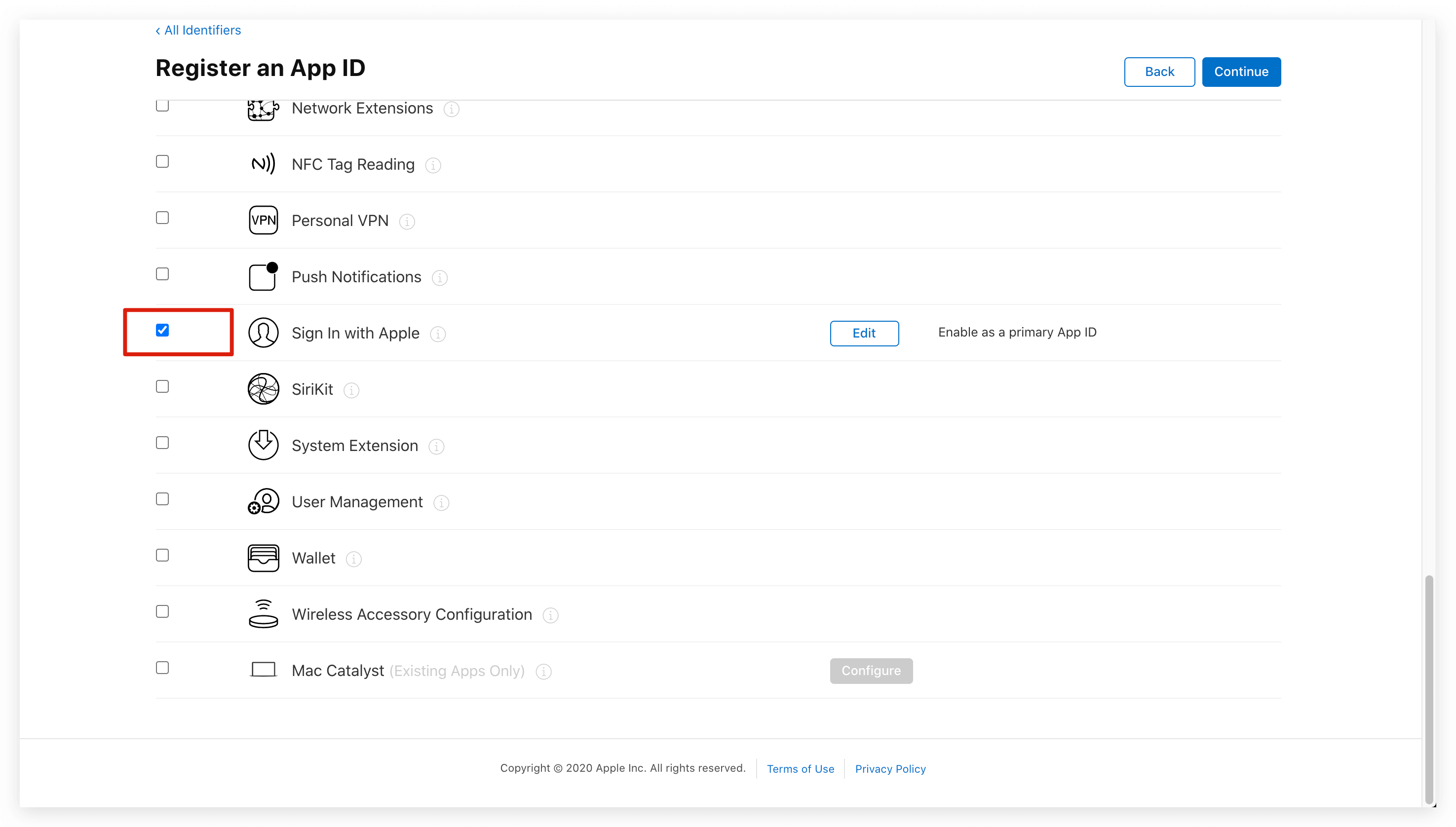 - Slide the browser to the bottom to find Sign in with Apple and check it