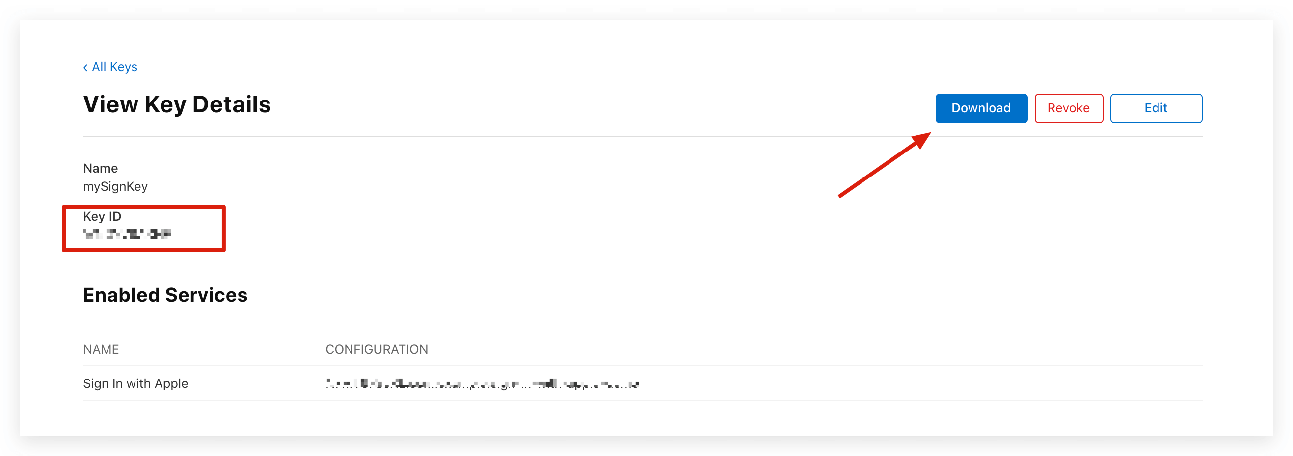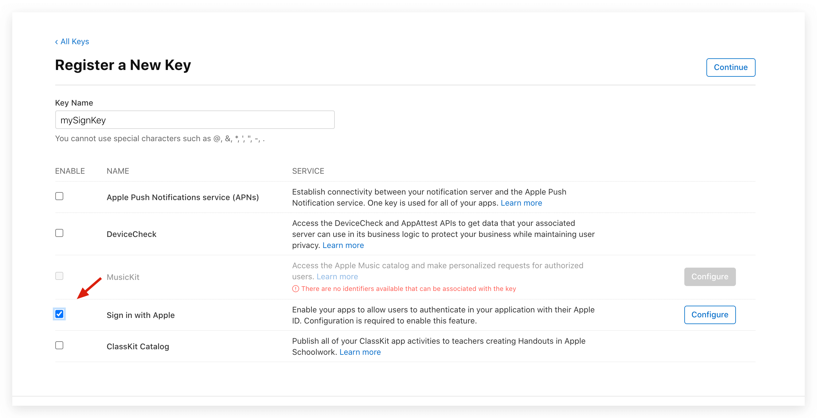 - Find the Service you just created, select Sign In with Apple, and click Configure: