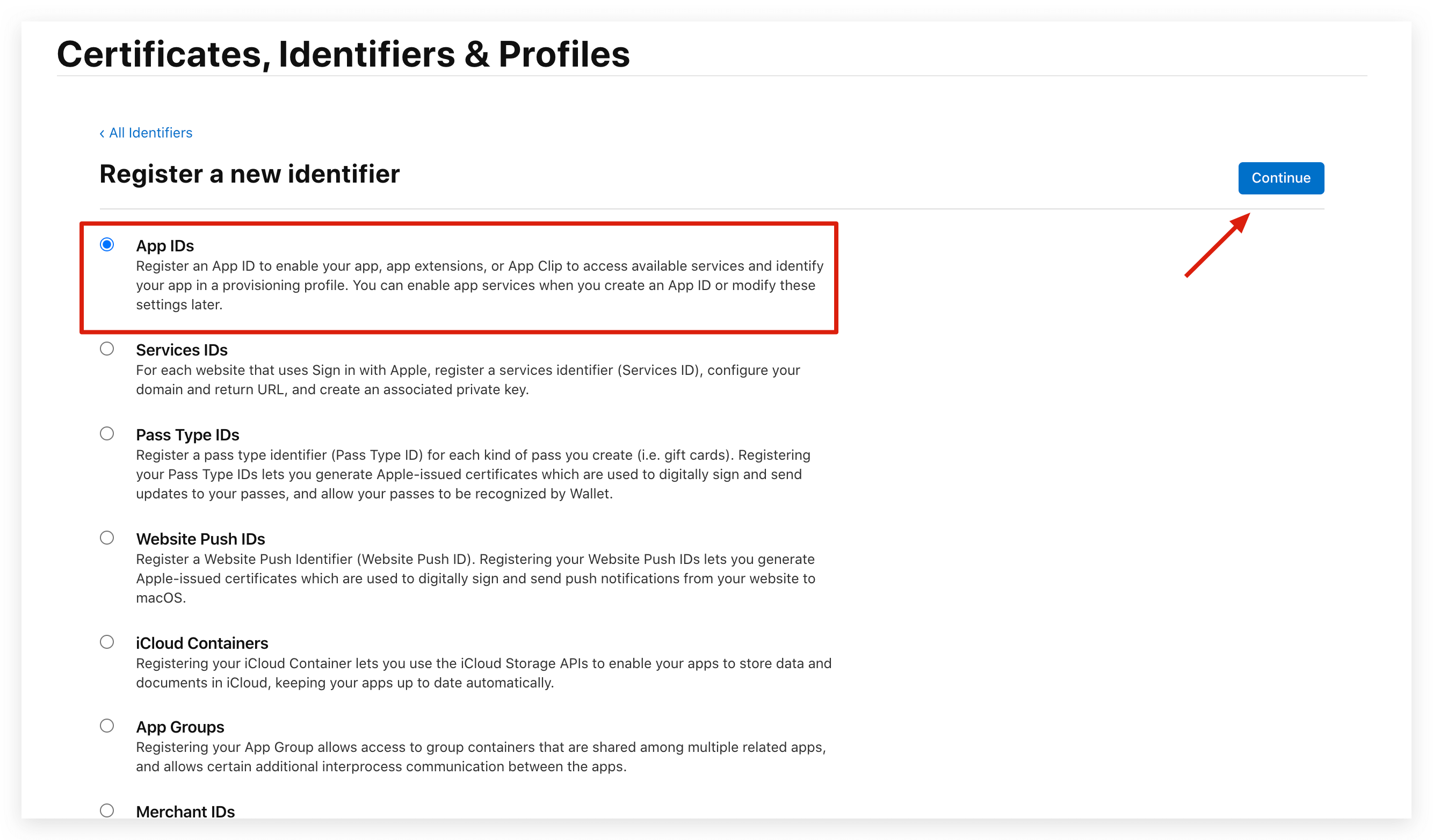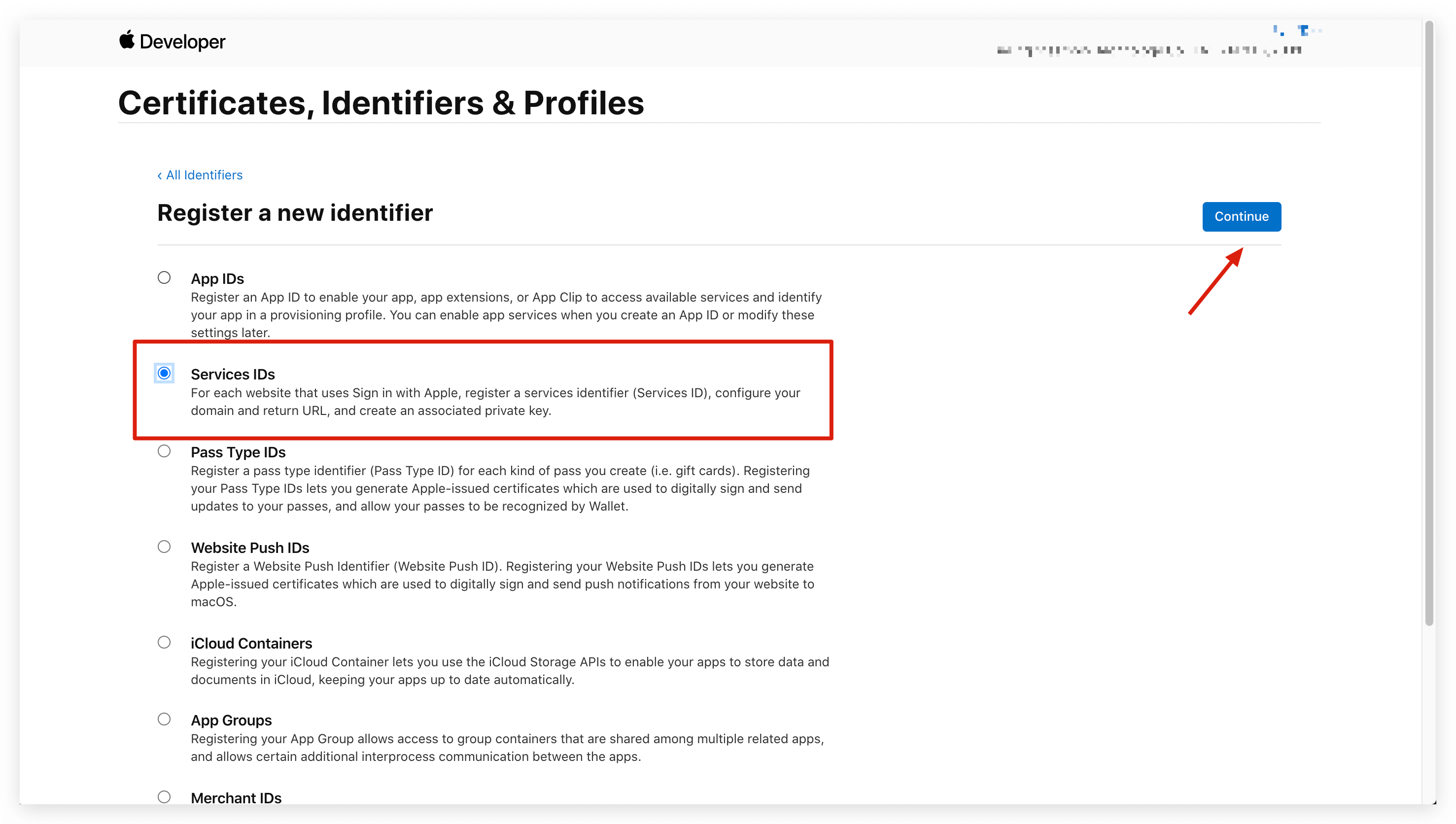 - Go back to Certificates, IDs, & Profiles, click the ➕ icon, select Services IDs, and then click the Continue button to continue: