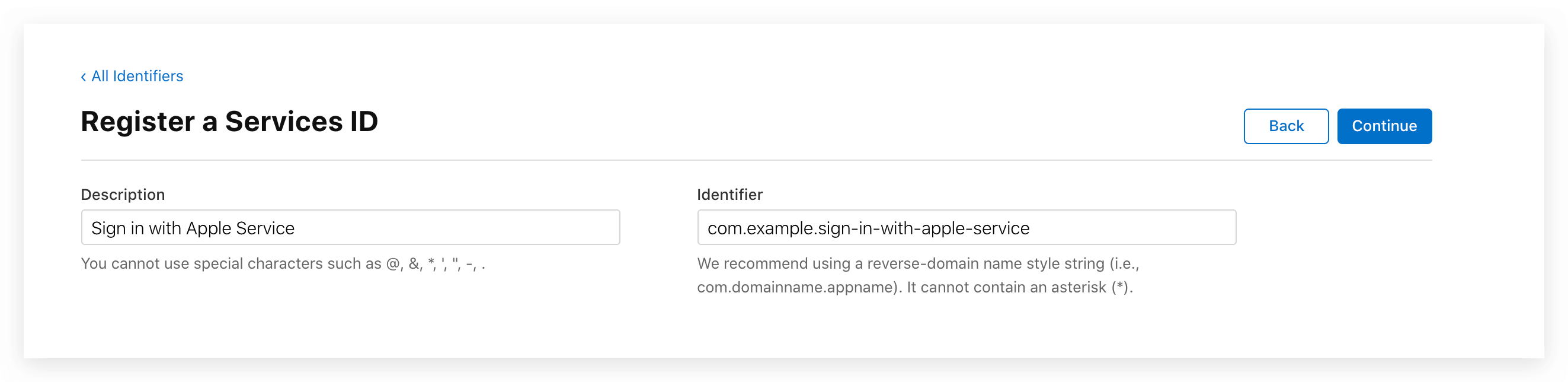 - Fill in the description and Identifier, then click the Continue button to create the Service: