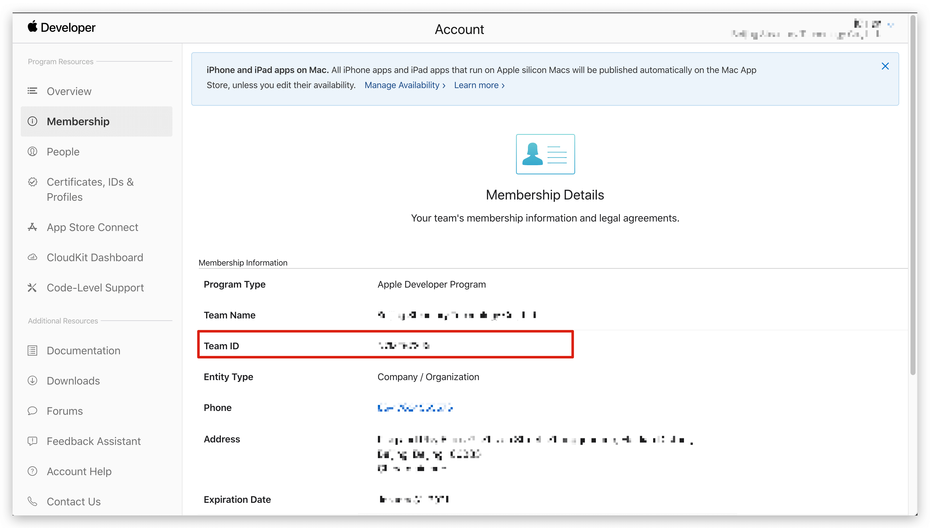 Go to the Membership page (opens new window) of the Apple Developer Portal (opens new window) and record the Team ID: