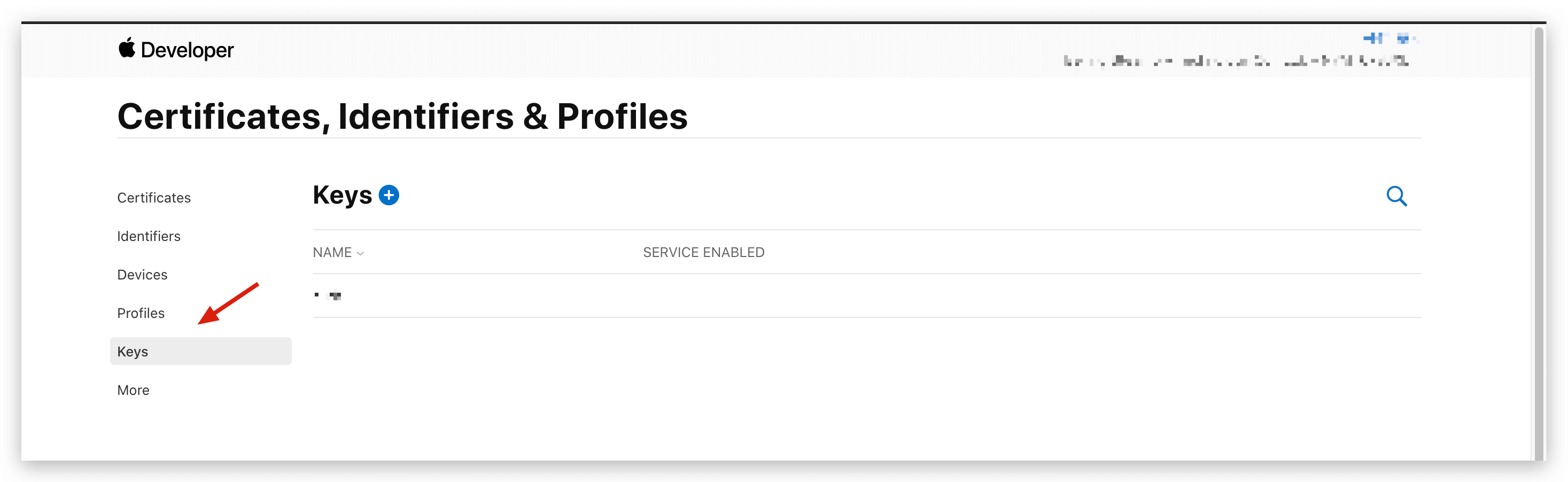 - Return to the Certificates, IDs, & Profiles page, switch to the Keys tab, and click the ➕ icon: