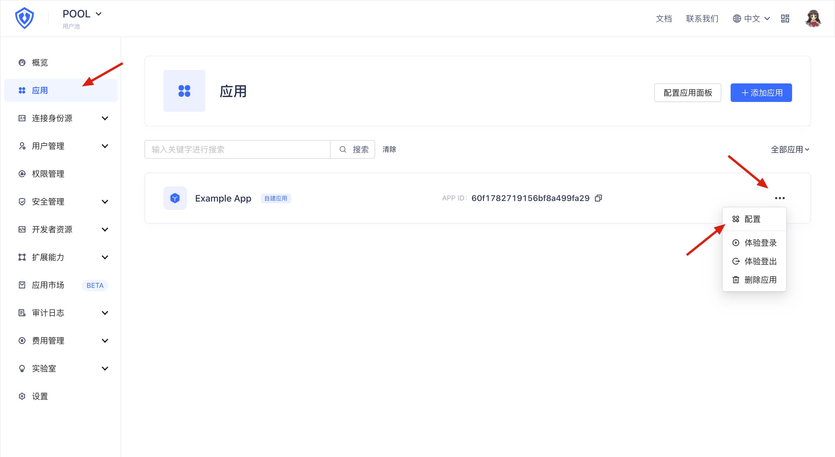 First open the GenAuth console and enter the user pool configuration page. Open the application panel, find the application you want to connect, and enter the application configuration page: