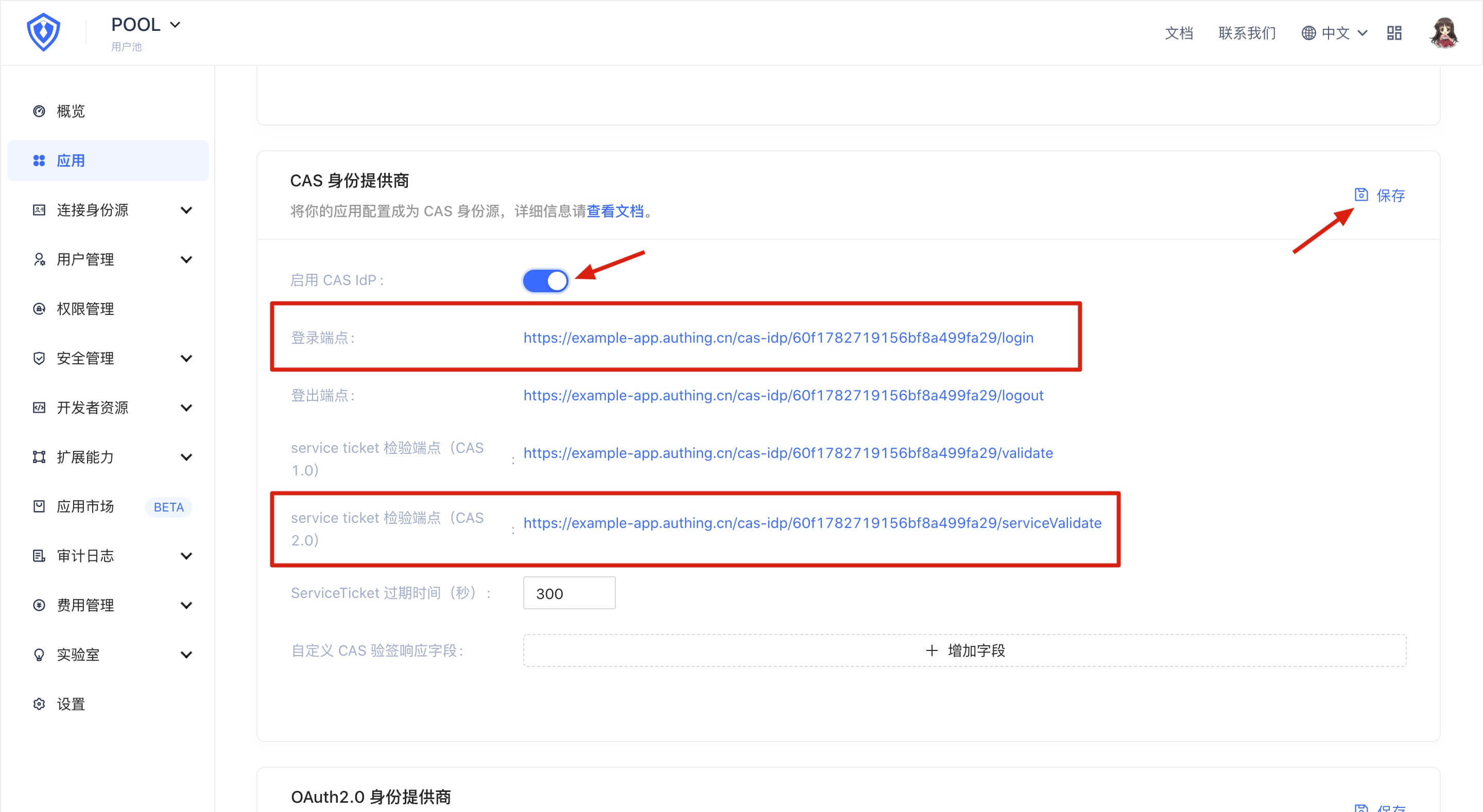 In the "Application Configuration" tab, find the "CAS Identity Provider" panel, turn on the "Enable CAS IdP" switch, and click the "Save" button. Record the contents of the "Login endpoint" and "Service ticket verification endpoint (CAS 2.0)", which will be used in the subsequent configuration.