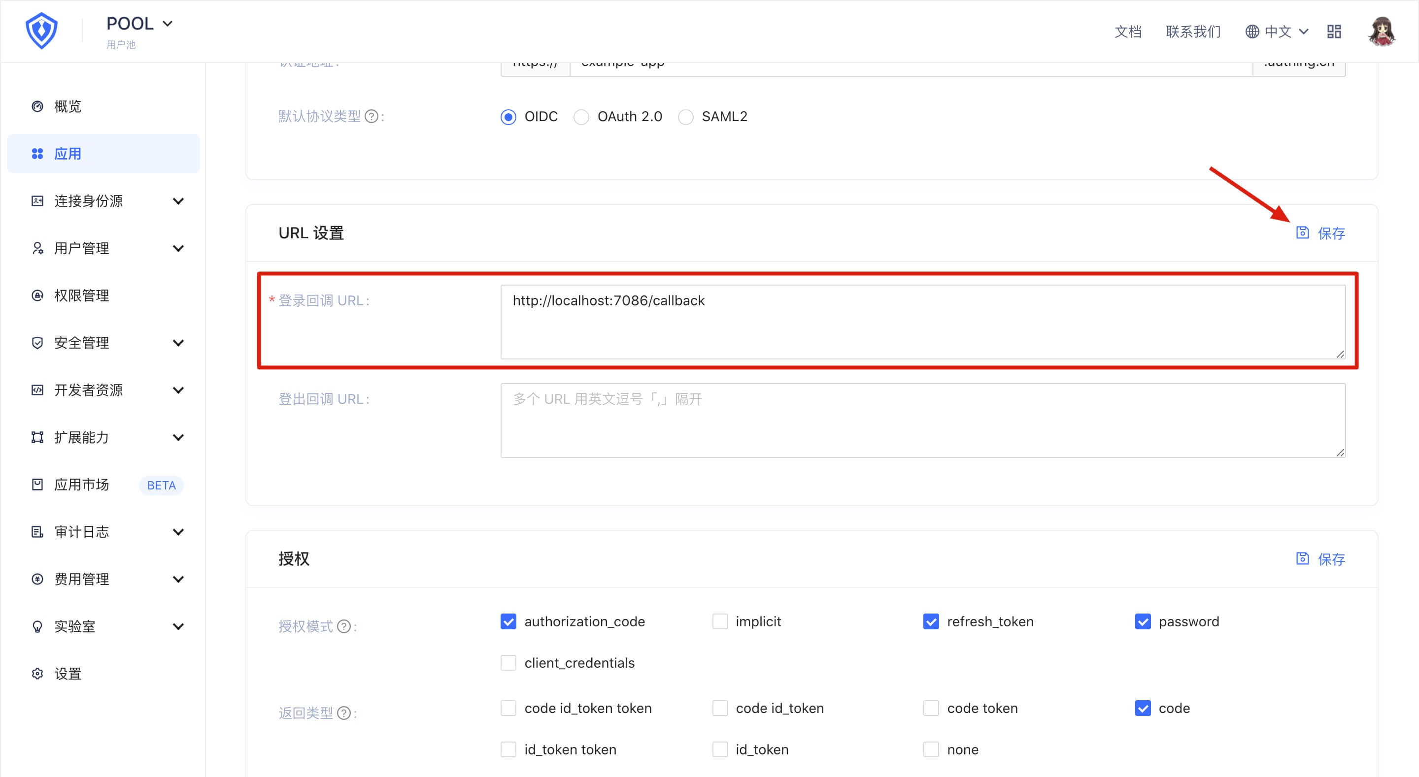 In addition, you need to find the "URL Settings" panel under the "Application Configuration" tab, and configure your own callback address in the "Login Callback URL" box to receive the Ticket parameter sent by GenAuth. If you don't know what this is, you can continue to read it and come back to configure this item later.