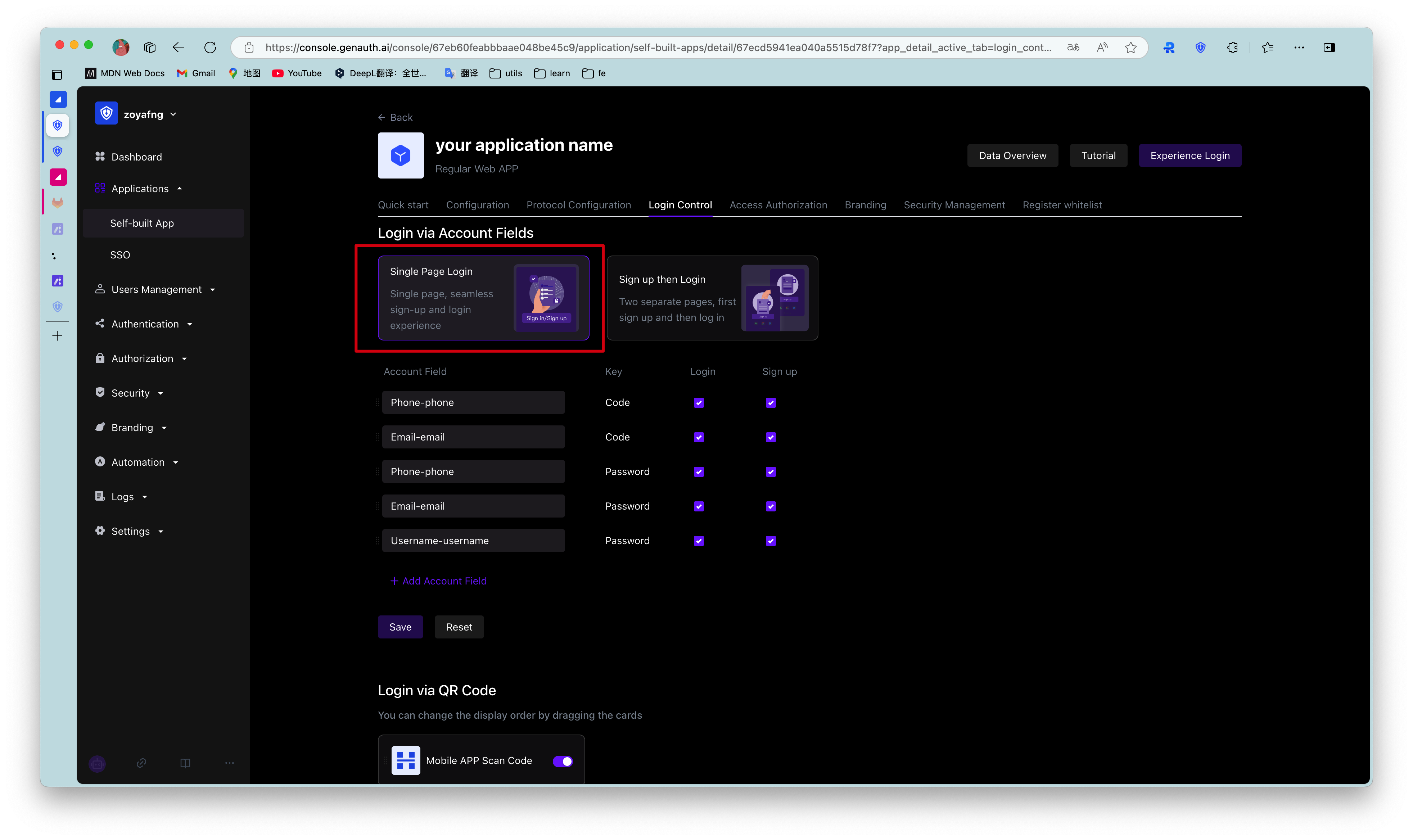 Each user pool in GenAuth has an independent second-level domain name and is equipped with an online login page. You can open the login page of this application by visiting the address of the application. GenAuth provides a lot of authentication methods for developers to choose and combine. You don't need to write a line of code. You can maintain the login page through the Login control of the self-built application on the hosted page and make some customized configurations.