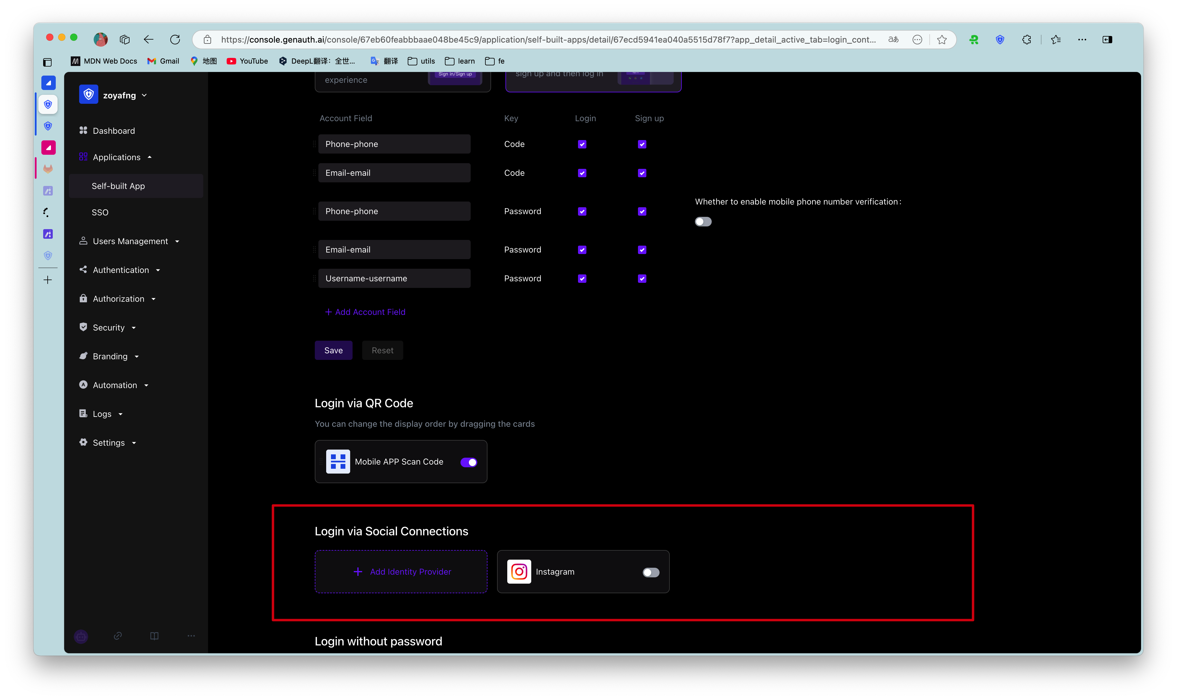 You can configure the login method by password, verification code and code scanning. GenAuth provides the following login combinations: