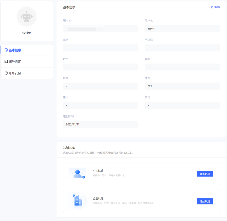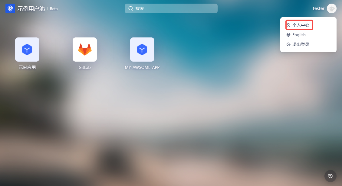 In the upper right corner of the application panel, users can click the Personal Center button to enter the user's personal center to edit personal information.