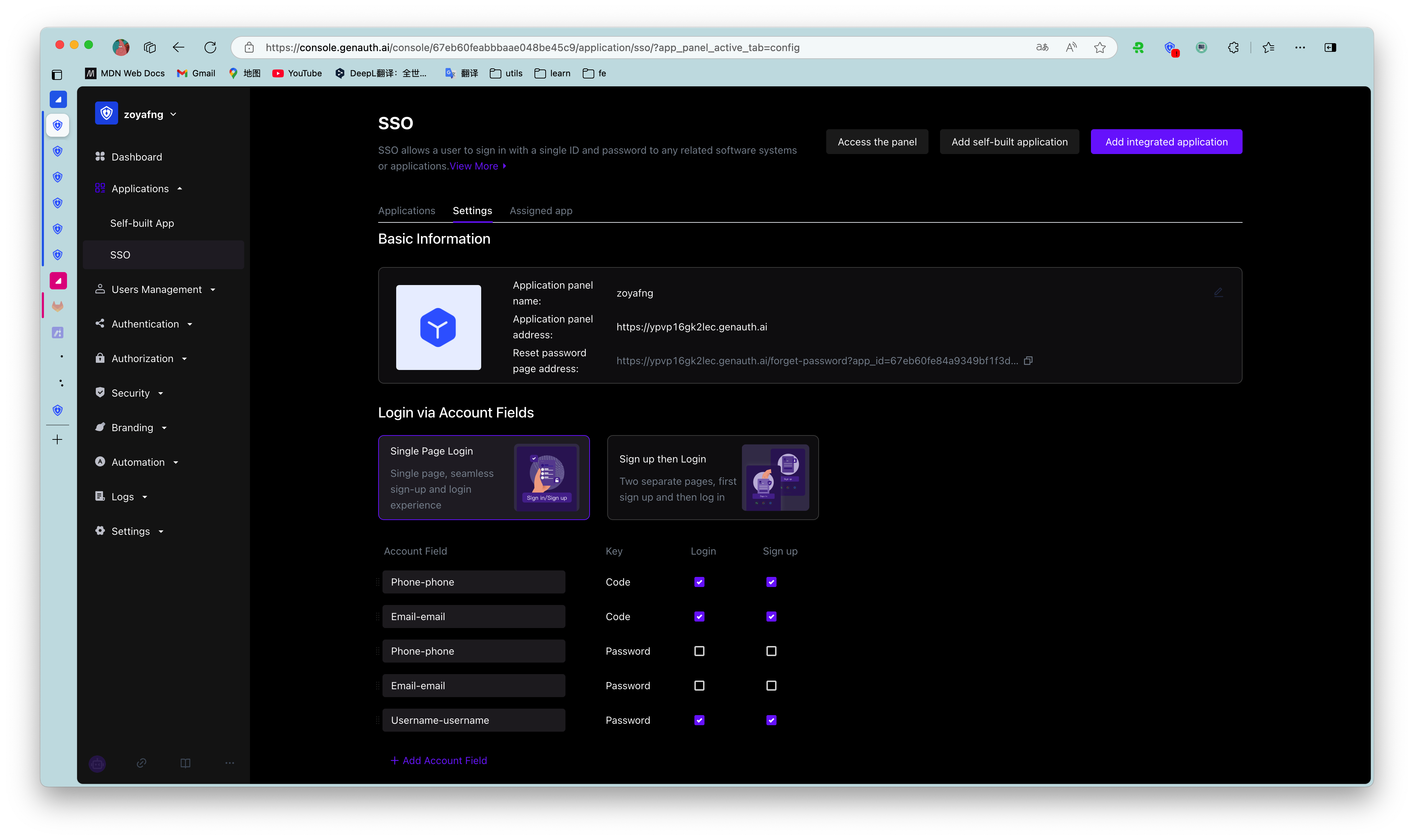 Enterprise administrators or administrators with GenAuth console permissions can go to the console Branding->App Panel->Basic Settings and App->Single Sign-On SSO->Configuration to configure the basic information of the application panel, login registration method, social login method, enterprise login method, etc. (For details, please refer to Login Control and Application Panel Configuration (opens new window)).