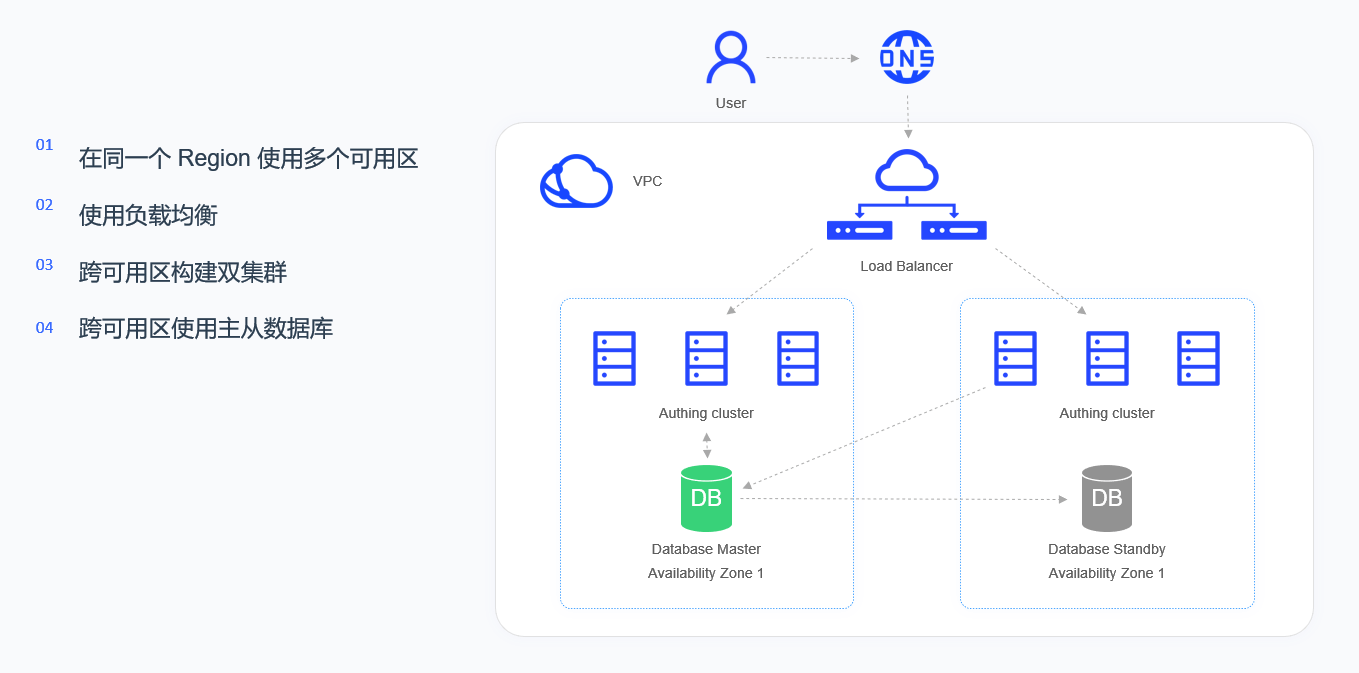 The high-availability architecture of the GenAuth IDaaS platform runs in VPC (virtual private cloud). Through LB (load balancing), the added multiple availability zones in the same region are virtualized into a high-performance and high-availability service pool, and the requests from the client are distributed to the availability zones in the service pool according to the load balancing rules.