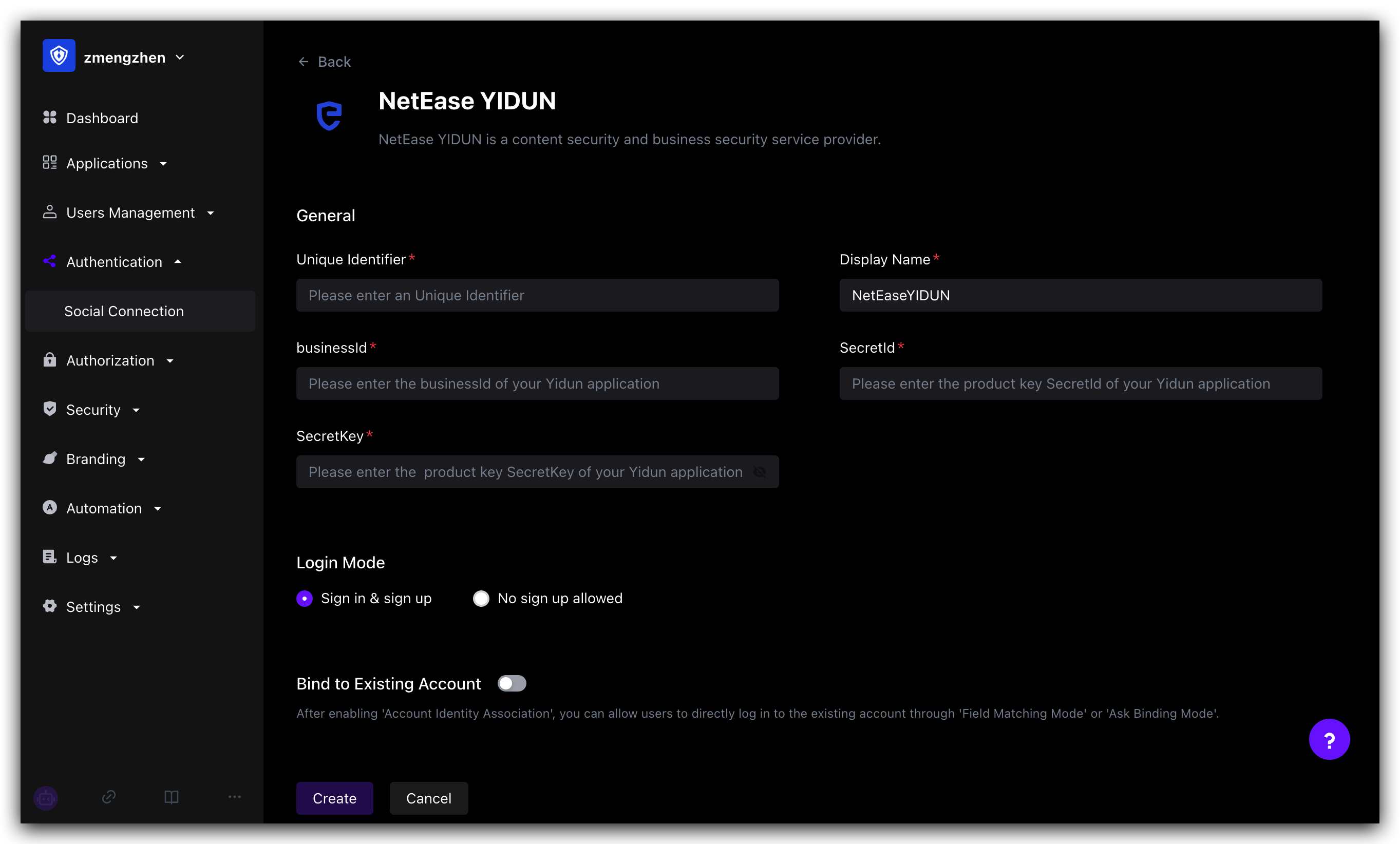 Fill in the Yidun backend information into the GenAuth console