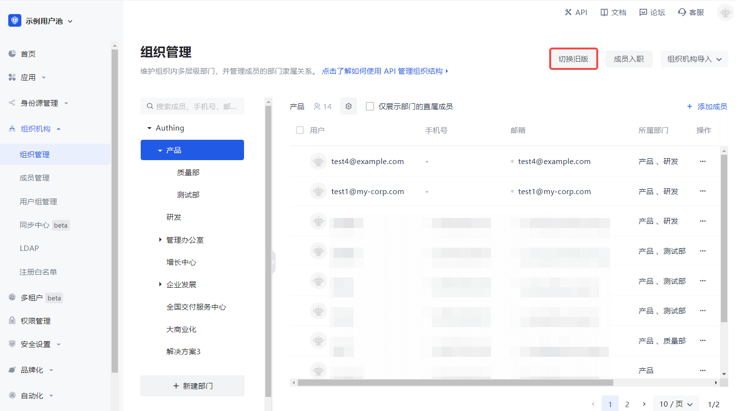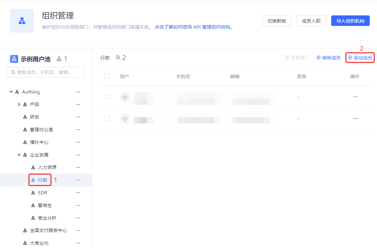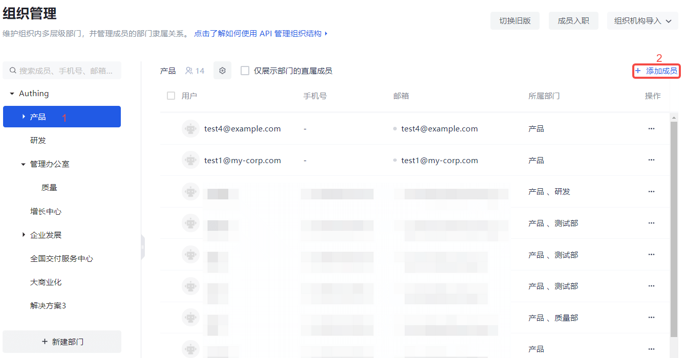 Organization management includes operations such as adding sub-departments, modifying departments, deleting sub-departments, moving sub-departments, obtaining sub-department lists, adding members, deleting members, obtaining member lists, etc. GenAuth supports two operation modes: console and API & SDK.
