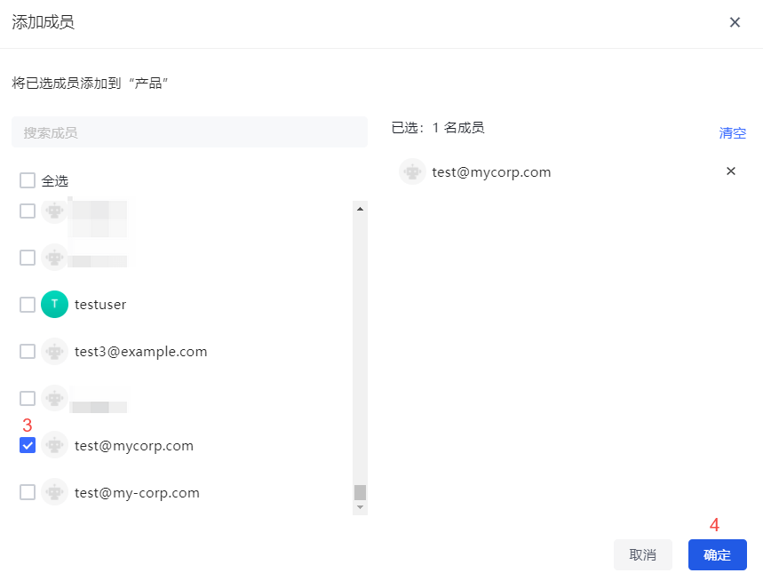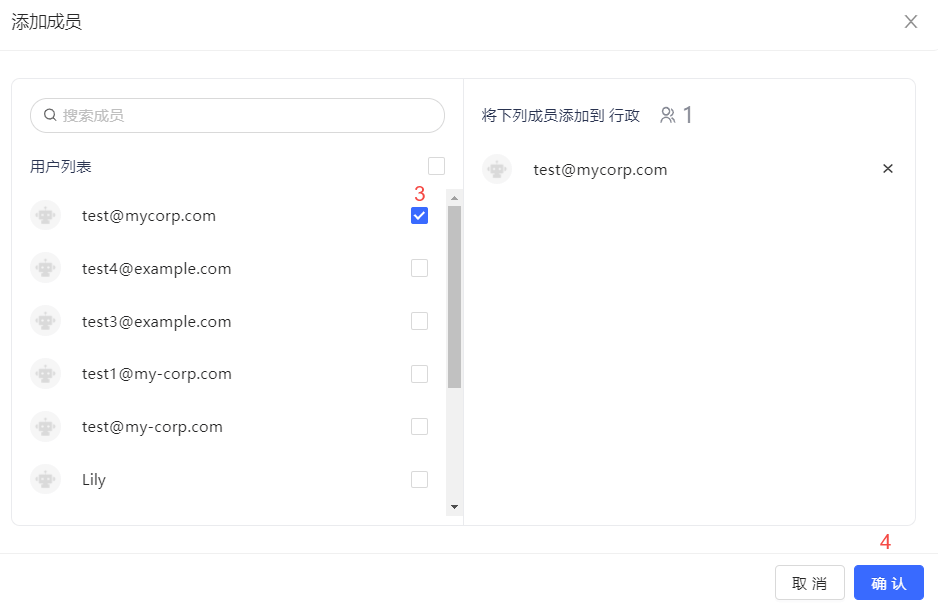 Check the target user in the User List on the left side of the pop-up window (you can also search by keyword). The selected user is automatically added to the list on the right.