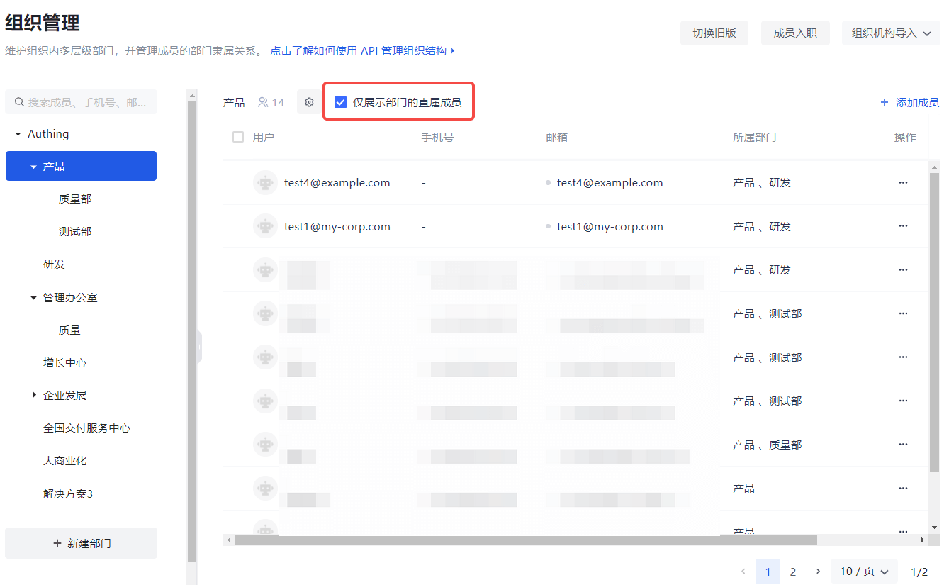 Get the list of members Click any level of organization/department in the organization tree to display the direct or all members under the current department in the list on the right (depending on whether Only display direct members of the department above the user list is checked).