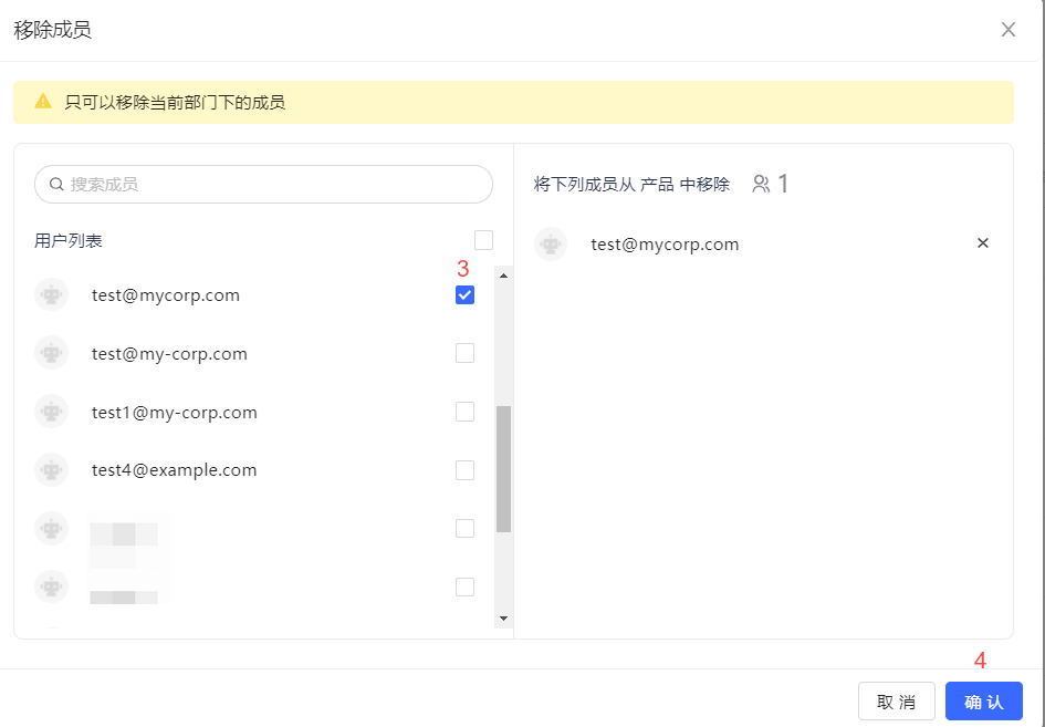 Check the member to be removed in the Remove Member pop-up window (you can also search by keyword).