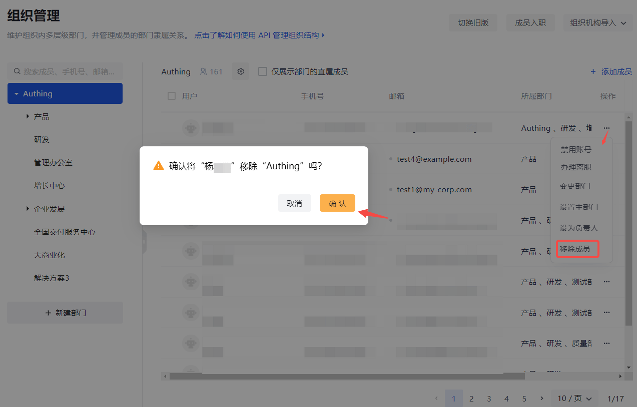 In the user list of the current organization/department on the right, click the row of the corresponding member to Remove Member .