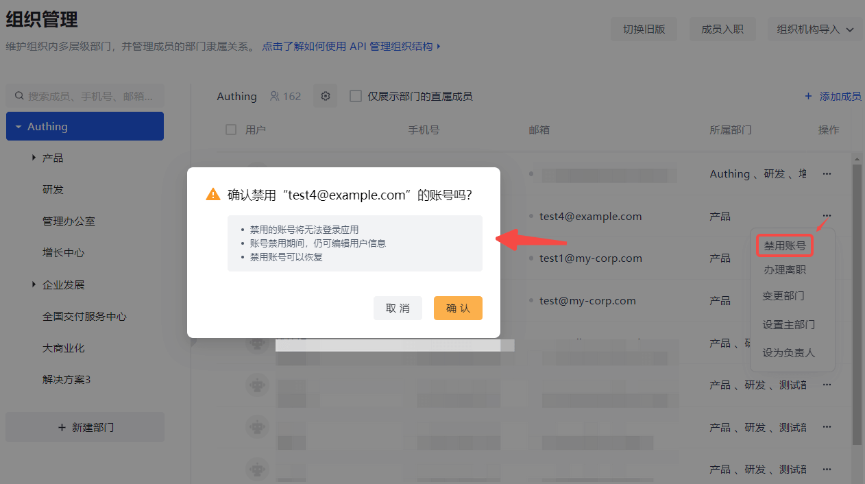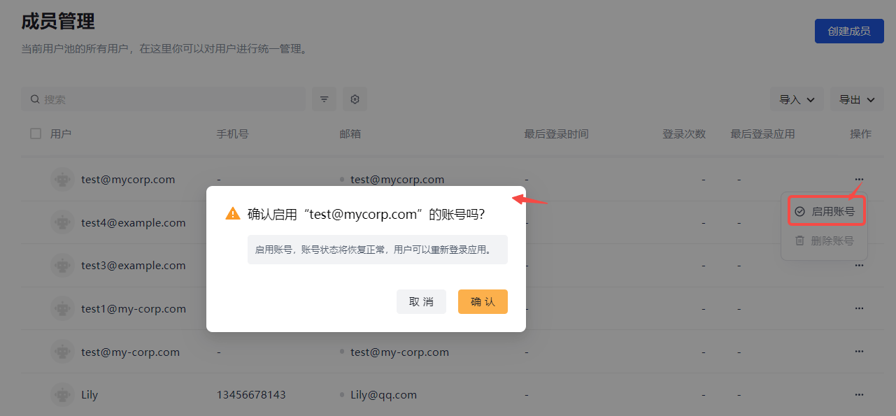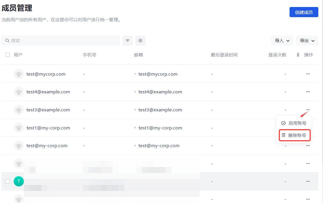 In an emergency such as an account being stolen, you need to temporarily disable the employee account. You can click the Disable Account button in the row of the employee on the Member Management page (User List page for B2B and B2C scenarios).