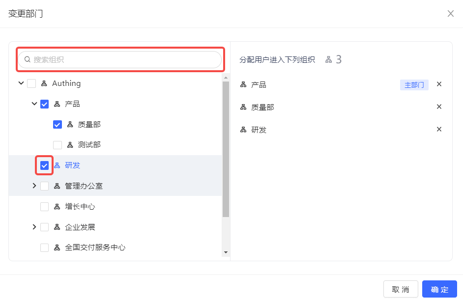 If a member needs to change departments during his/her employment, he/she can click the Change department button on the Organization management page, check the target department in the open window, or search in the search box and check it. The changed department will be displayed in the list on the right side of the window: