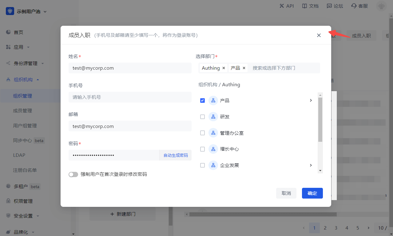 You can create an account using a mobile phone number or email address, enter your name, mobile phone number/email, and select department in the Member onboarding window: