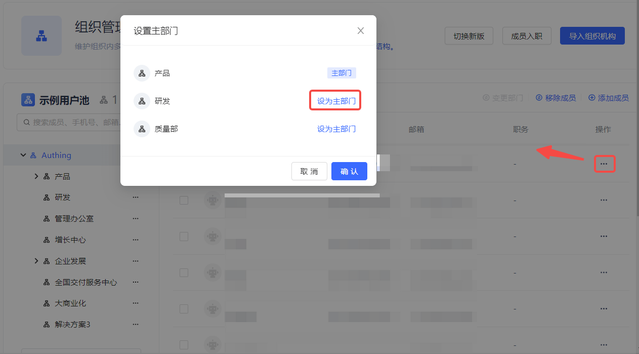 You can also click the Set Main Department button in the row of the target member in the user list on the Organization Management page: