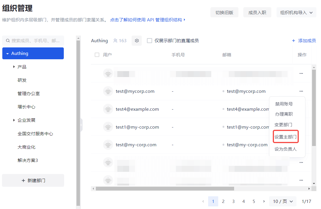 If the current member belongs to multiple departments, you can set one as the main department. To do this, you can click the Set Main Department button in the row of the target member in the user list on the Organization Management page: