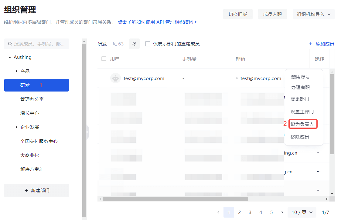 Click the row of the corresponding member in the user list of the current organization/department on the right Set as head.