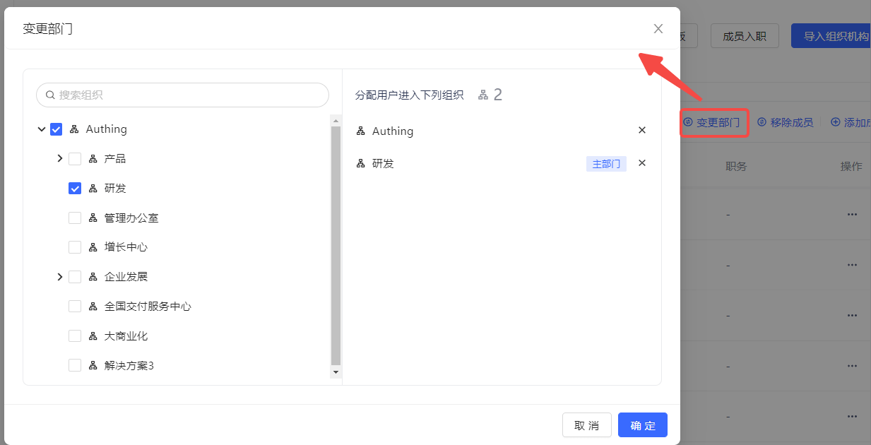 If the current member belongs to multiple departments, one can be set as the main department. To do this, just click Set to Main Department in the department list on the right side of the Change Department window above, and then click OK: