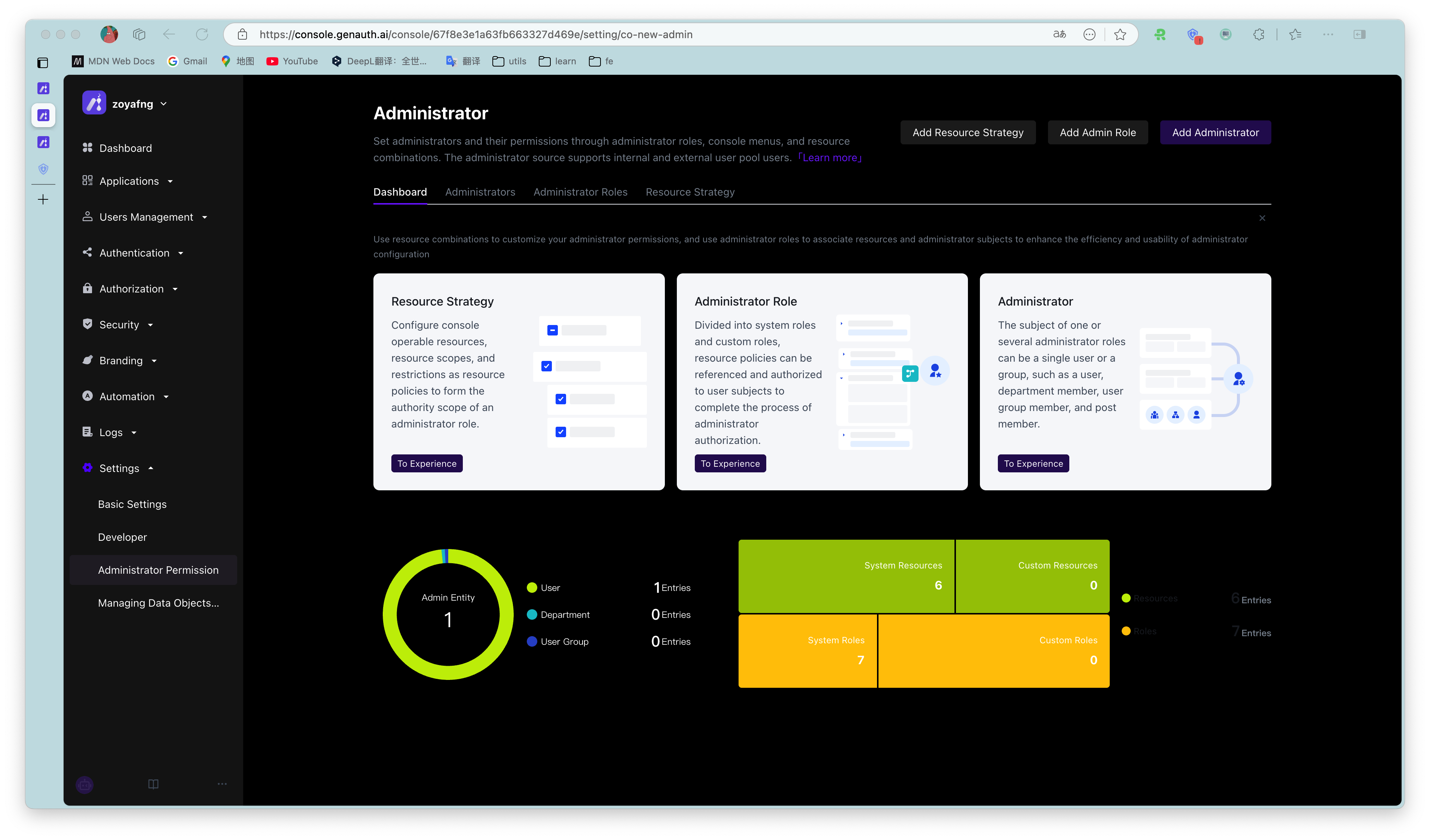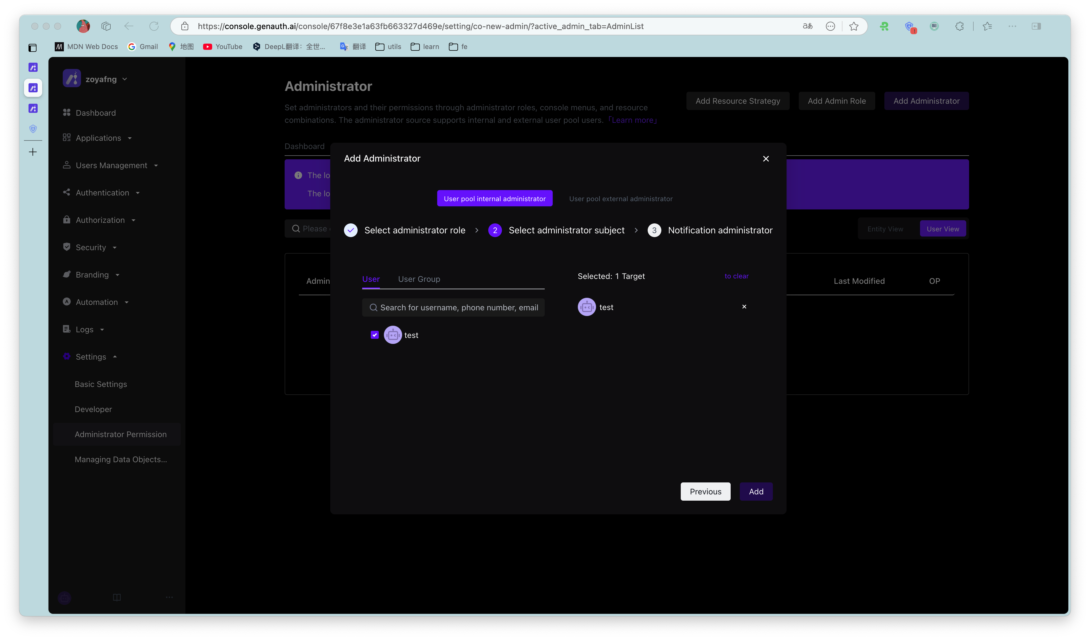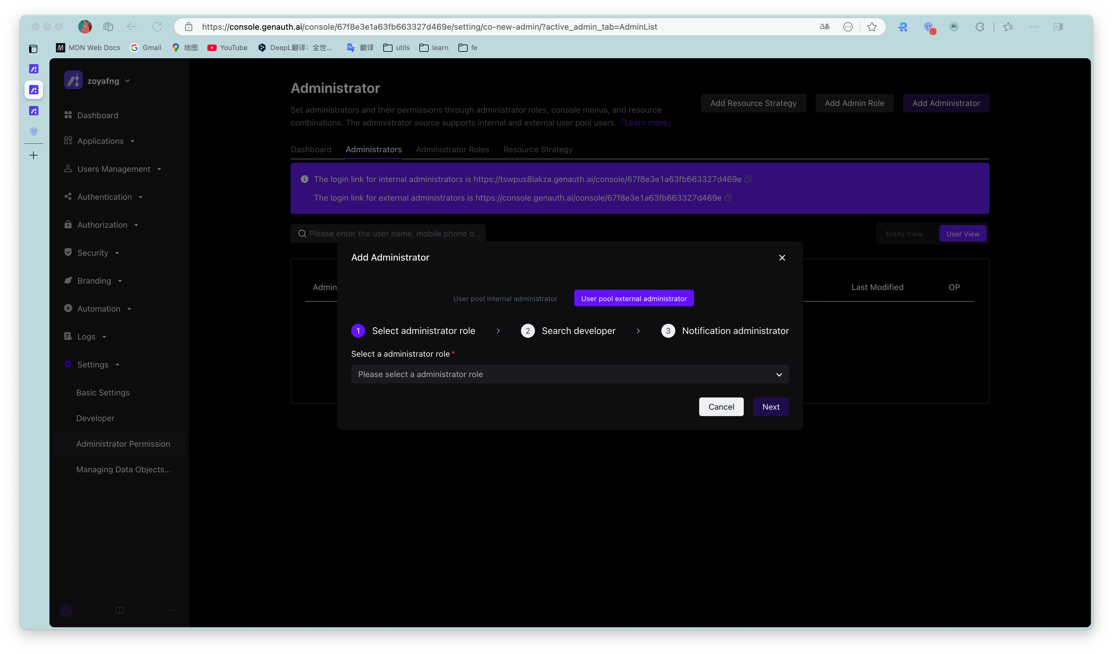 All external administrators are concentrated in the GenAuth official user pool as the owners of their respective user pools. An external administrator A can authorize the user pool resources he is responsible for to B, the owner of another user pool in the GenAuth official user pool, to assist A in managing his user pool. The authorized owner B will see the user pool that A is responsible for in the user pool list of the GenAuth official user pool.