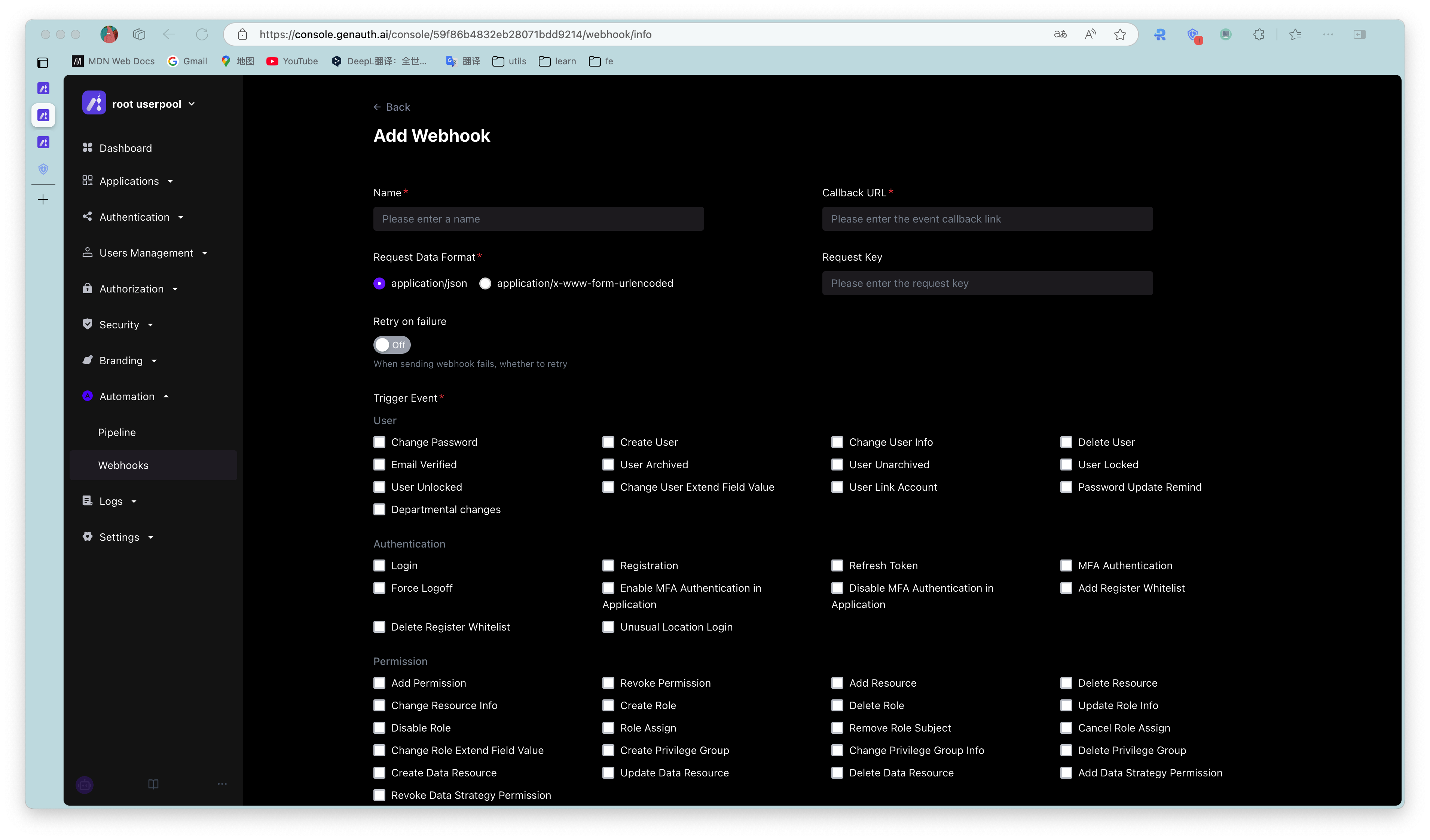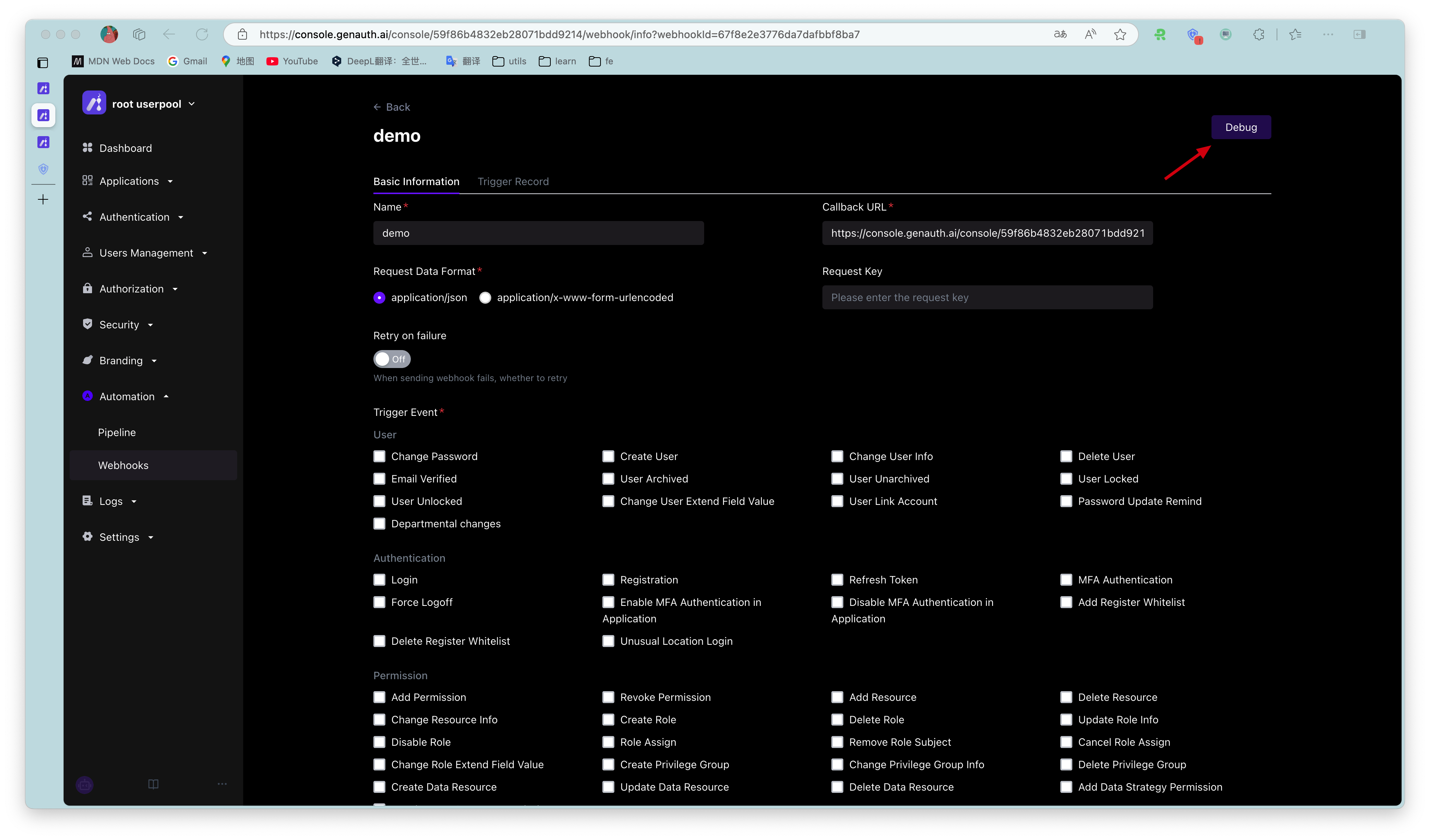 The method to use Webhook is to configure the HTTP URL in the GenAuth platform. When your user logs in, registers, or changes the password, a POST request will be sent to the remote HTTP URL.