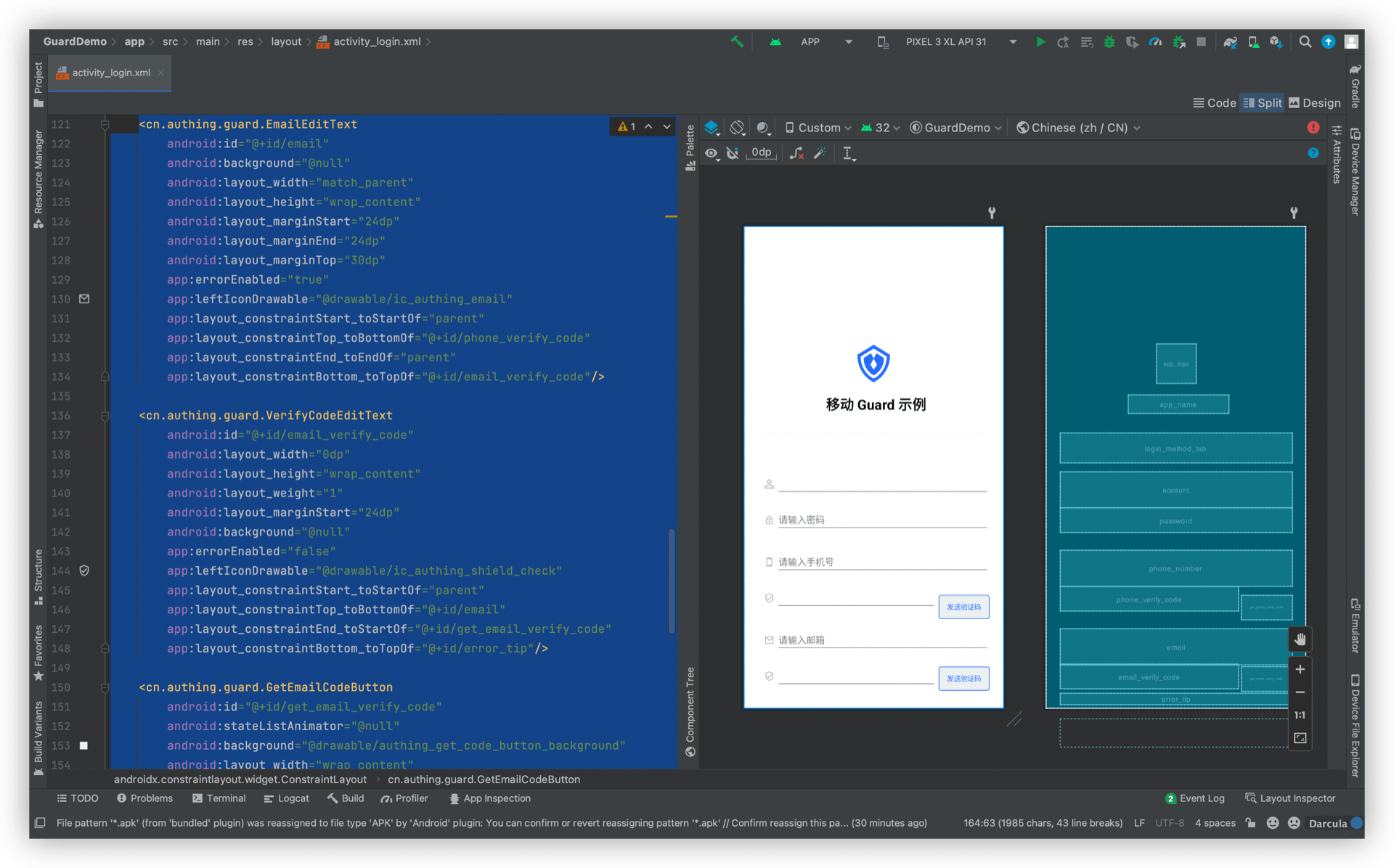 再放置一个 LoginContainer,将 EmailEditText、VerifyCodeEditText、GetEmailCodeButton 放到第三个 LoginContainer 里面,设置 type 属性,app:type="emailCode"。