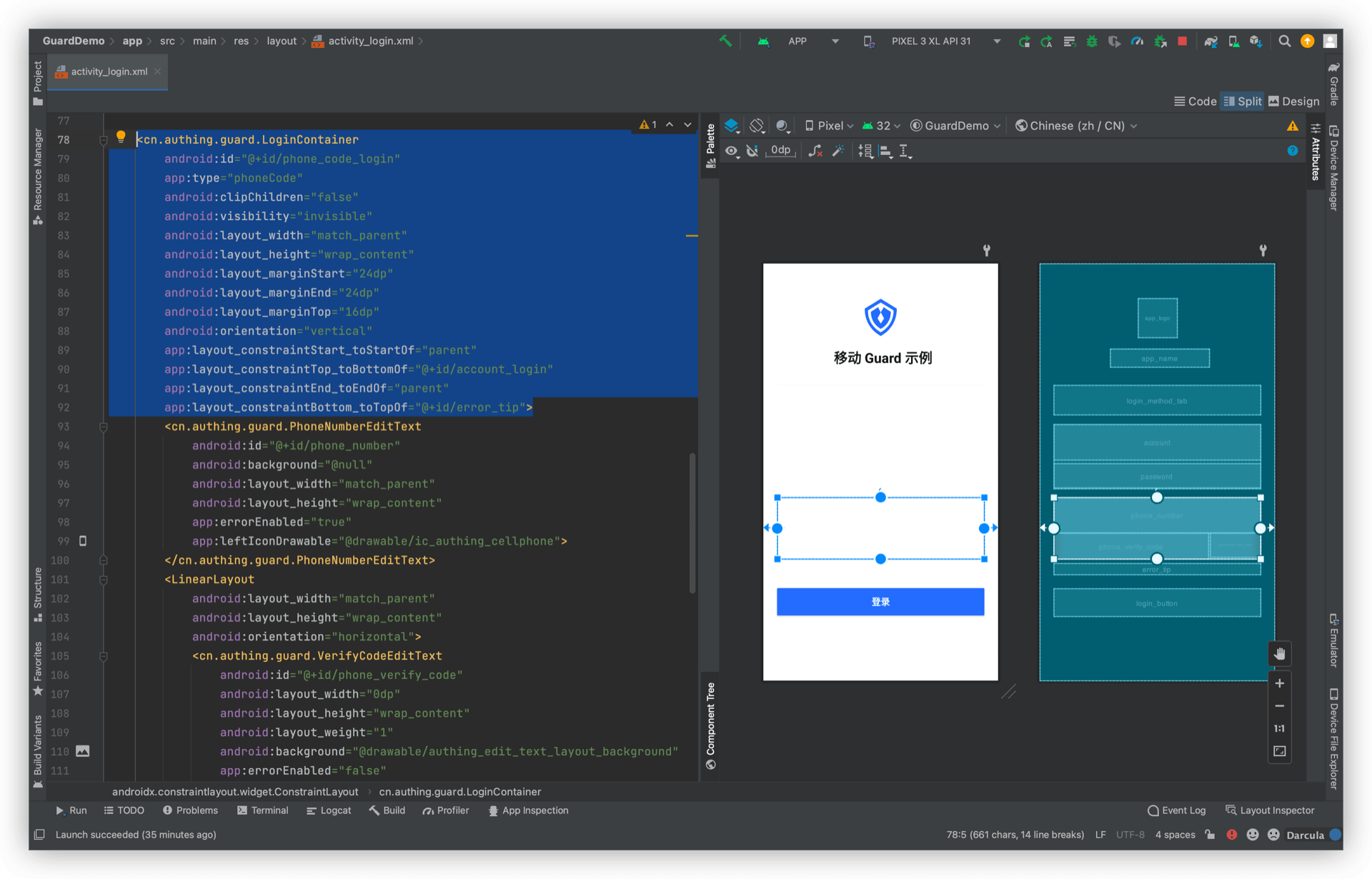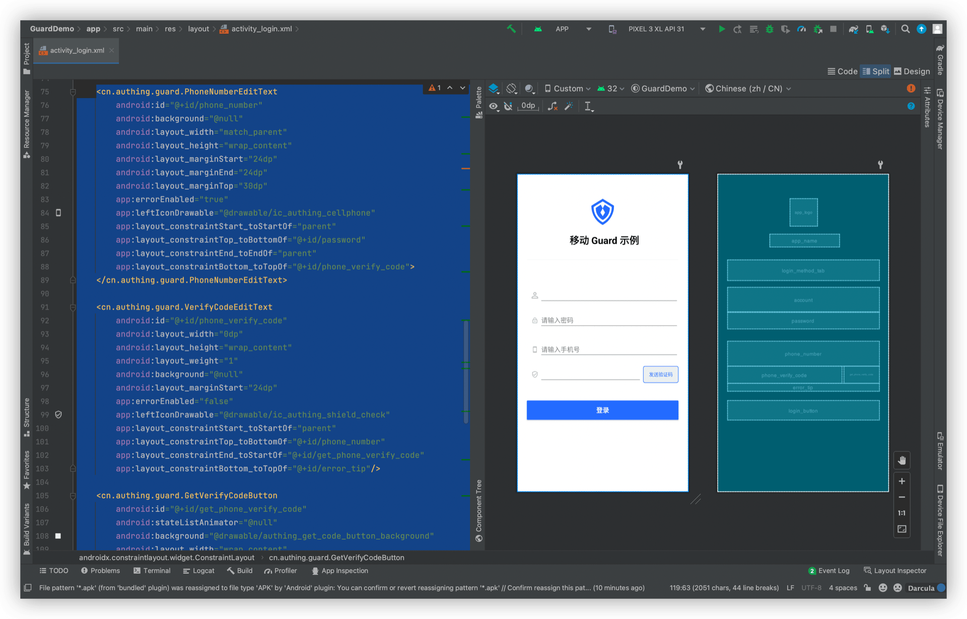 再放置一个 LoginContainer,将 PhoneNumberEditText、VerifyCodeEditText、GetVerifyCodeButton 放到第二个 LoginContainer 里面,设置 type 属性,app:type="phoneCode"。