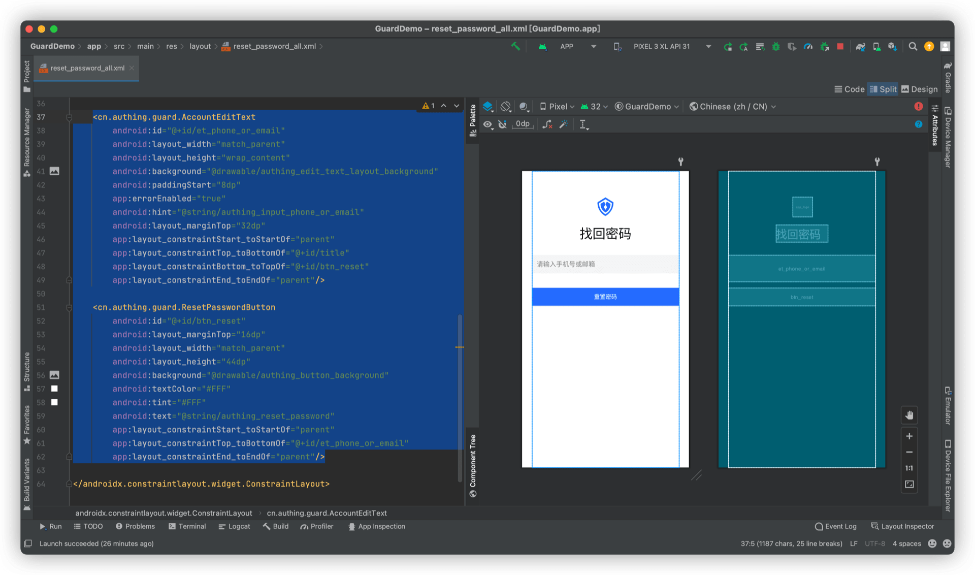新增一个导航入口页面,放置 AccountEditText、ResetPasswordButton,如下图: