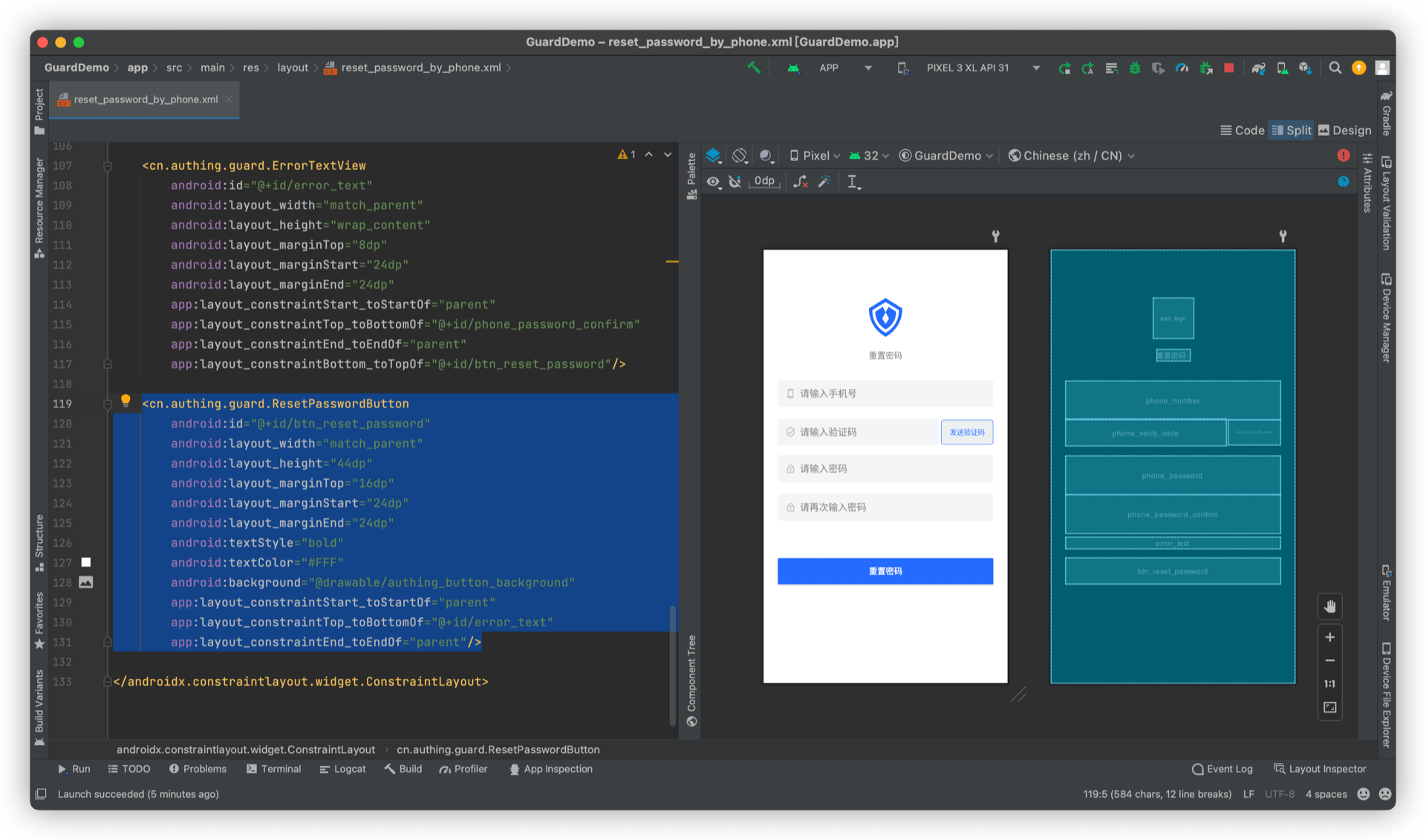 依次放置以下超组件: AppLogo、AppName、PhoneNumberEditText、VerifyCodeEditText、GetVerifyCodeButton、PasswordEditText、PasswordConfirmEditText、ErrorTextView