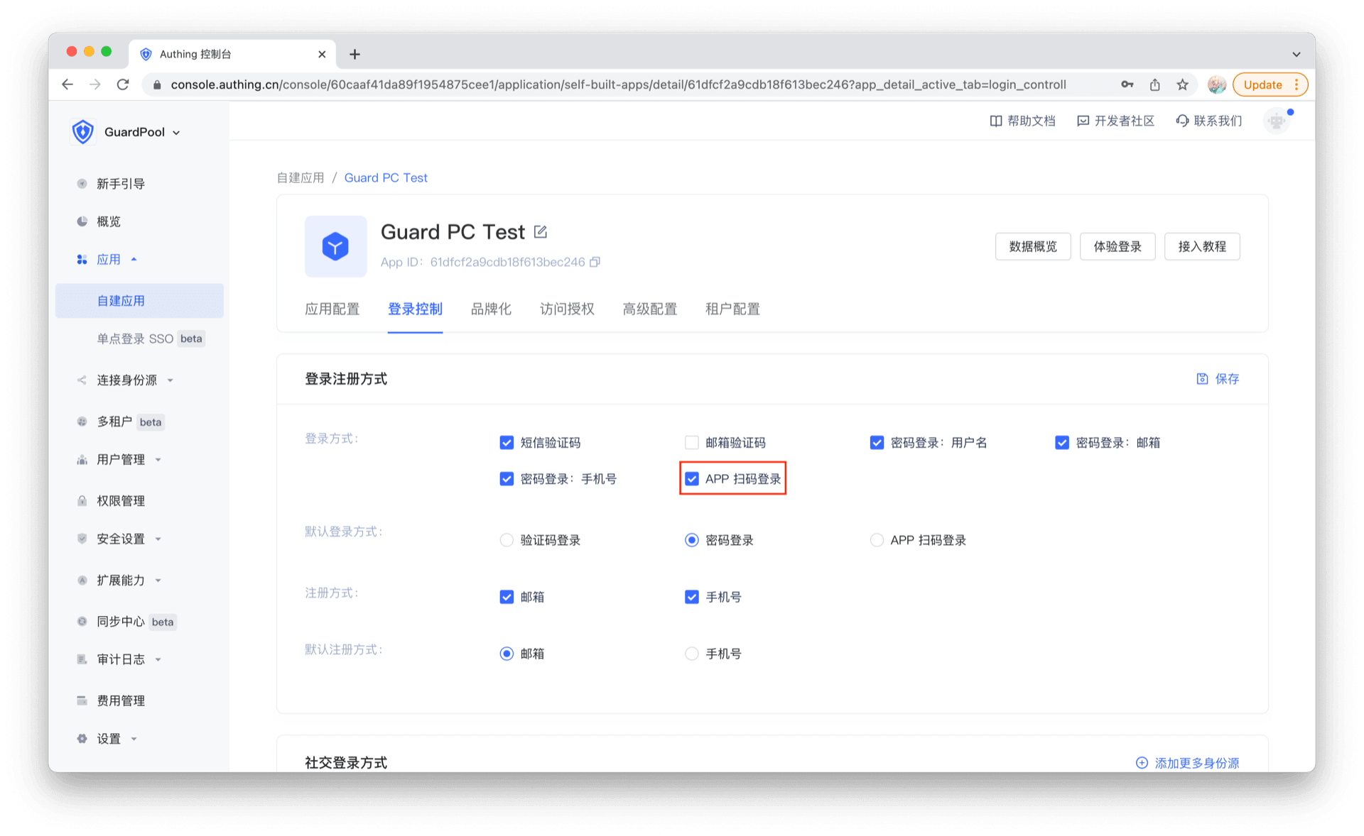 要使用自建 App 扫码登录能力,请在 GenAuth 控制台勾选 "App 扫码登录" 选项。