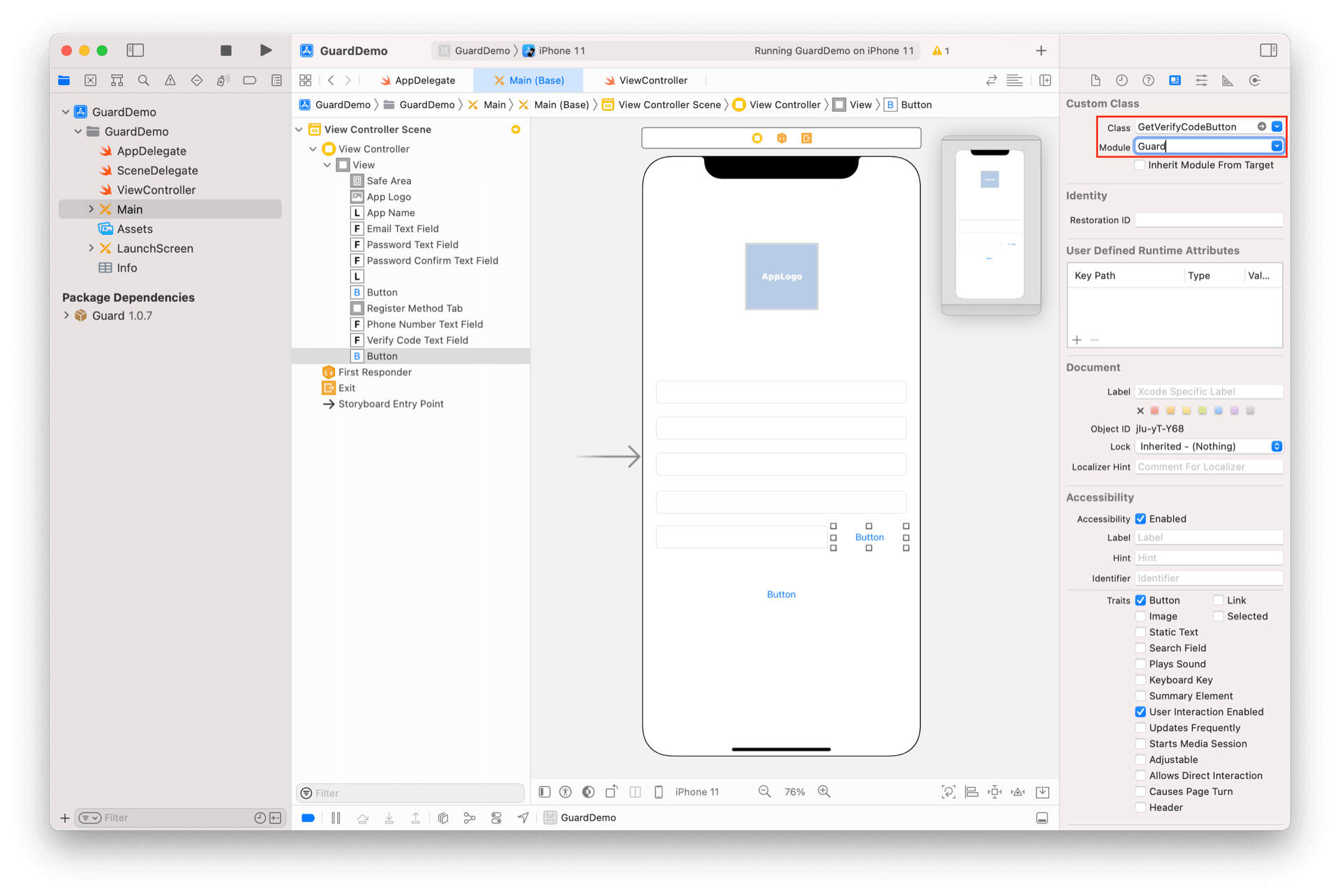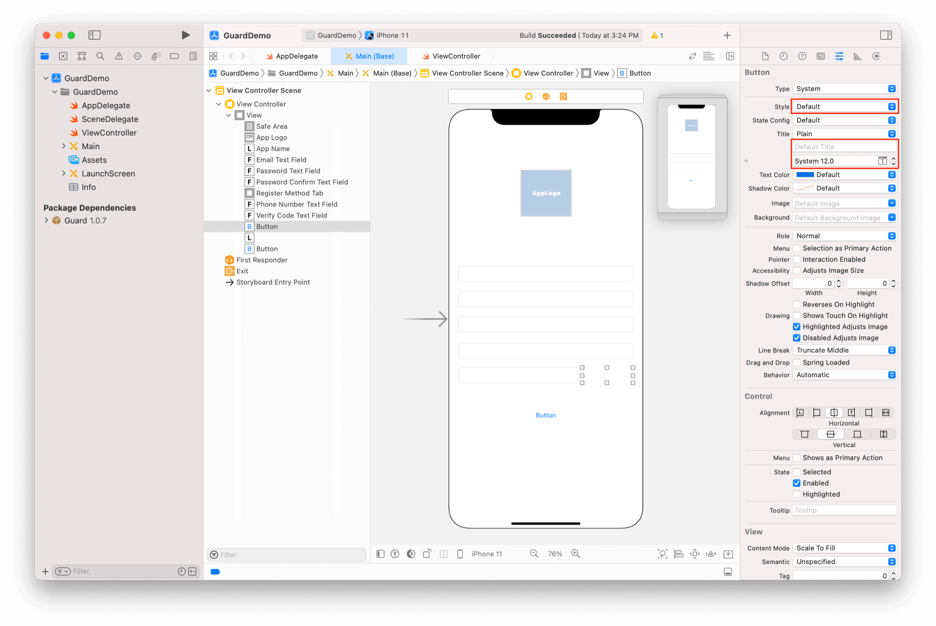 iOS 默认按钮文字较大,我们修改一下 GetVerifyCodeButton 的属性,同时去掉默认的 "Button" 文字