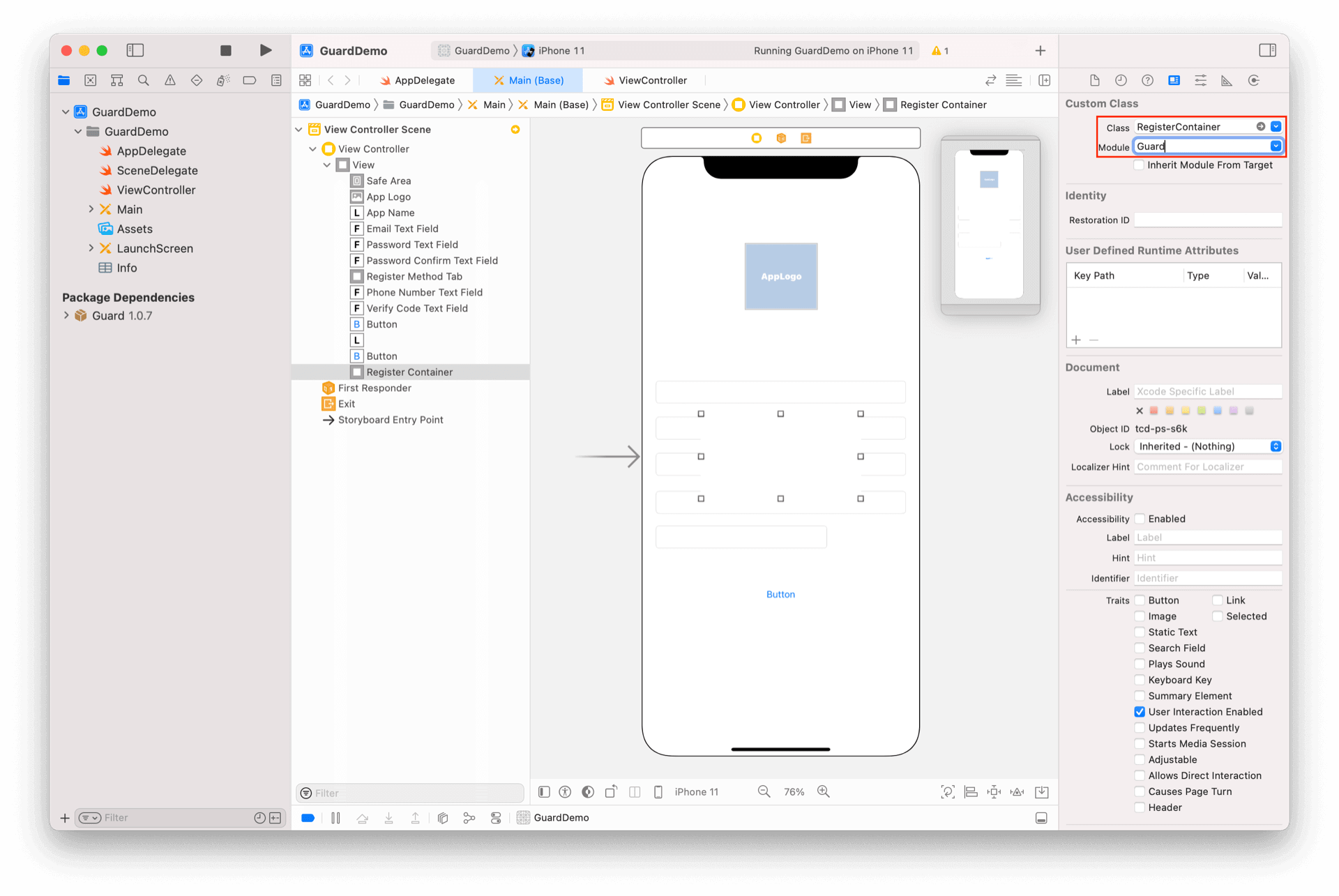放置两个 UIView,将它们的类型改为 RegisterContainer