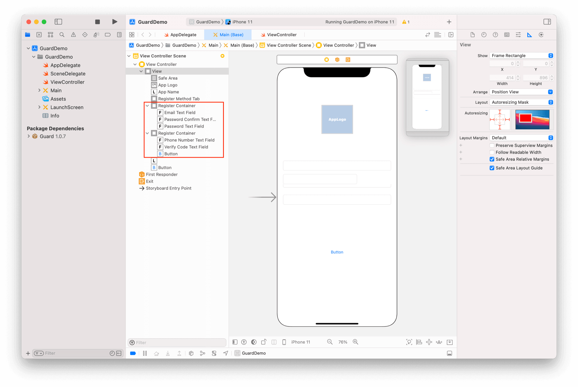 将 PhoneNumberTextField、VerifyCodeTextField、GetVerifyCodeButton 放到第二个 RegisterContainer 里面。