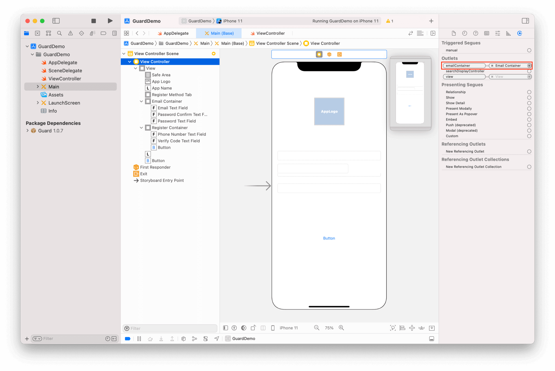 这时如果运行应用程序,会发现“邮箱注册”容器里面为空。因为 RegisterContainer 默认类型为 0,表示通过手机号码+验证码注册,因此,我们需要将邮箱注册的 RegisterContainer 的类型改为 1。首先在 ViewController 里面声明一个 @IBOutlet 成员变量