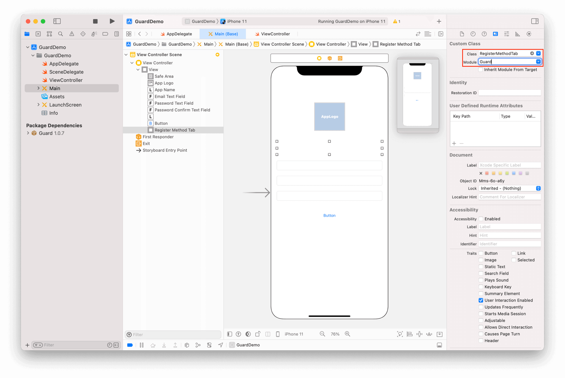 放置一个 UIView,将其类型改为 RegisterMethodTab