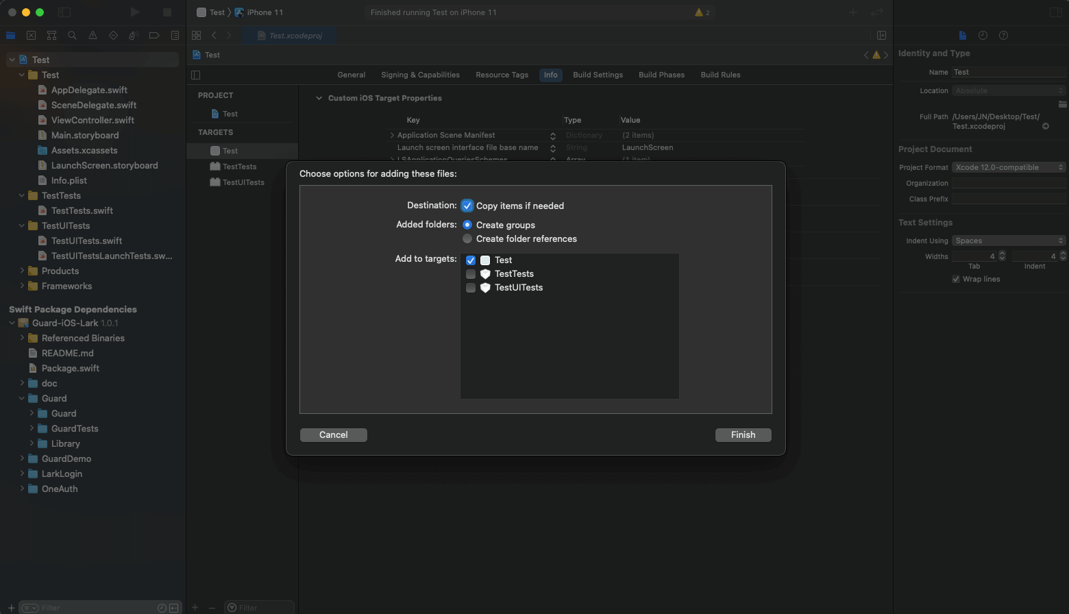将 LarkSSO 目录中的 LarkSSO.bundle 拖入工程项目目录下,勾选 Copy items if needed