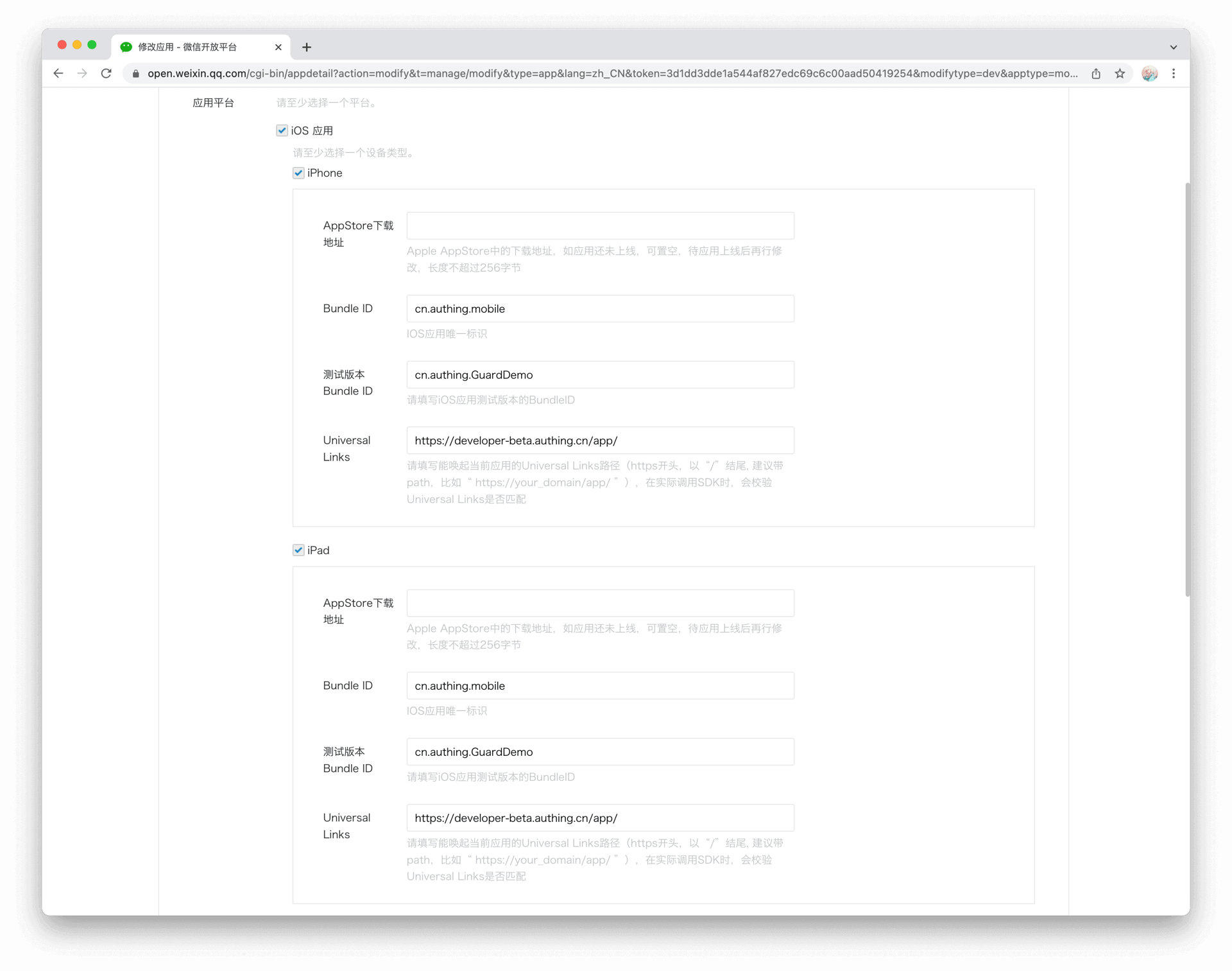 第一个参数为微信应用 id;第二个参数为 iOS Universal Link (opens new window)
