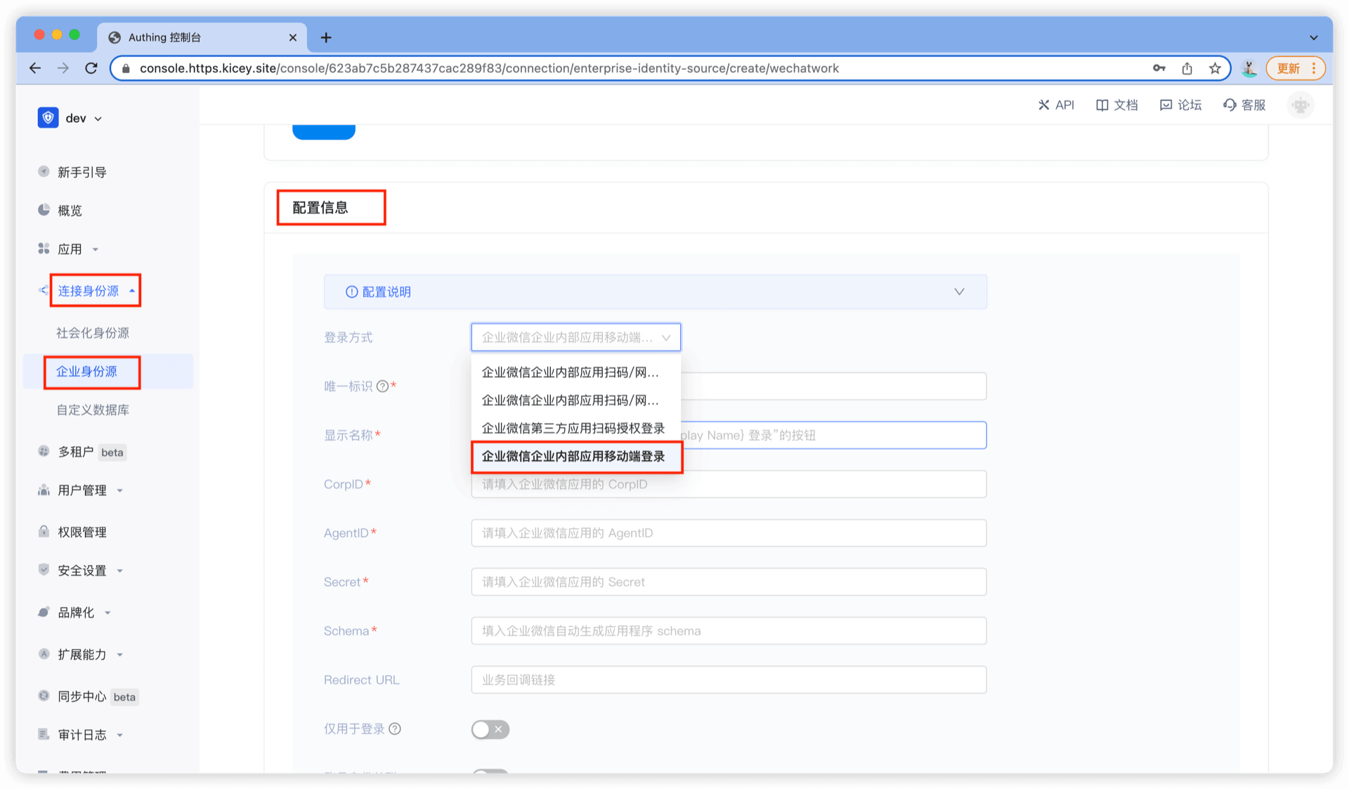 在控制台的 “连接身份源” 菜单选择 “创建企业身份源“