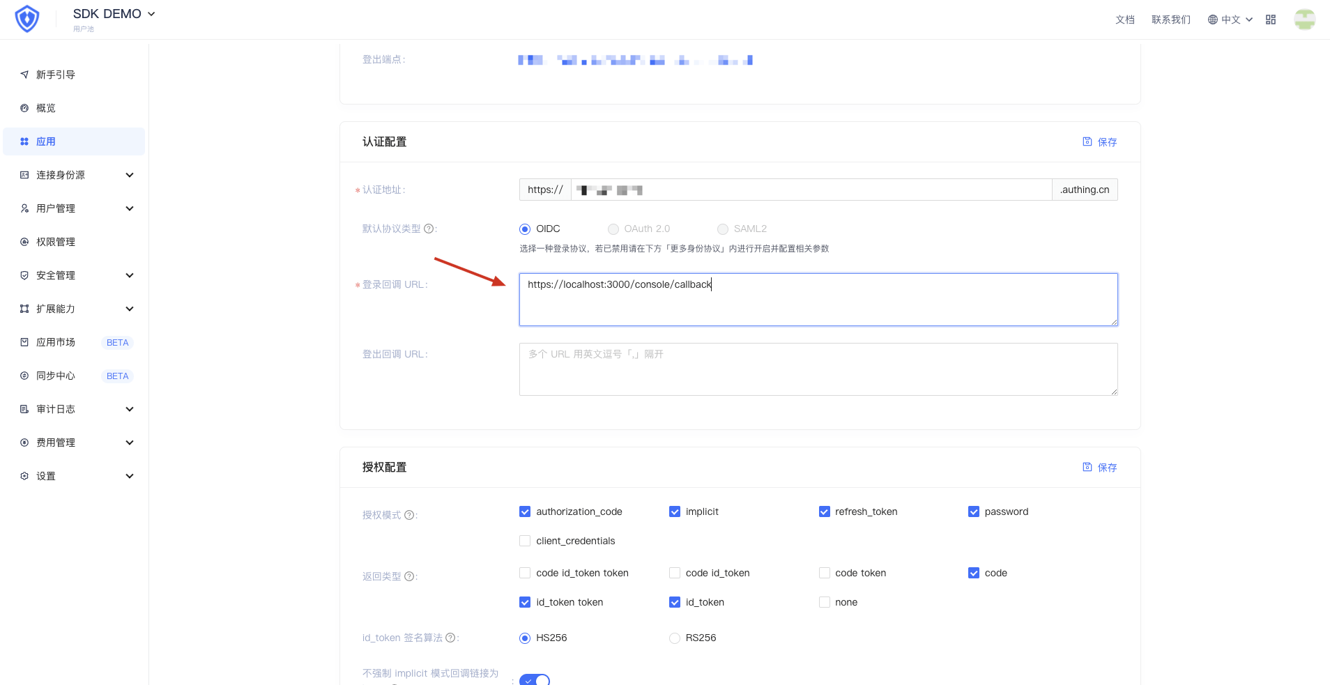 - 找到应用配置下的认证配置,配置登录回调 URL 并进行保存