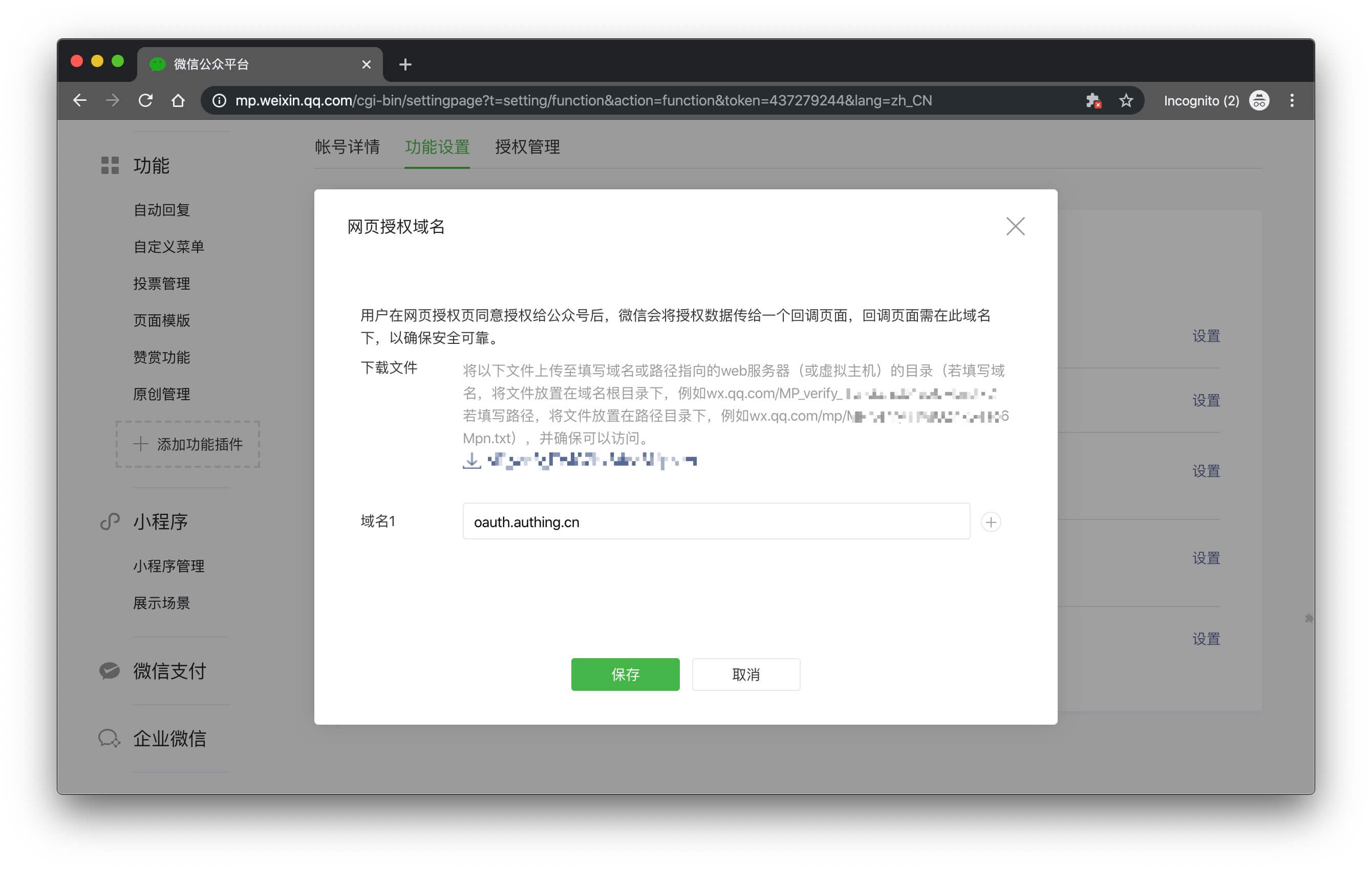 出于安全验证考虑,微信服务器需要和 GenAuth 服务器做一次请求验证,开发者需要下载 txt 文件,并记录 文件名 和 文本内容。