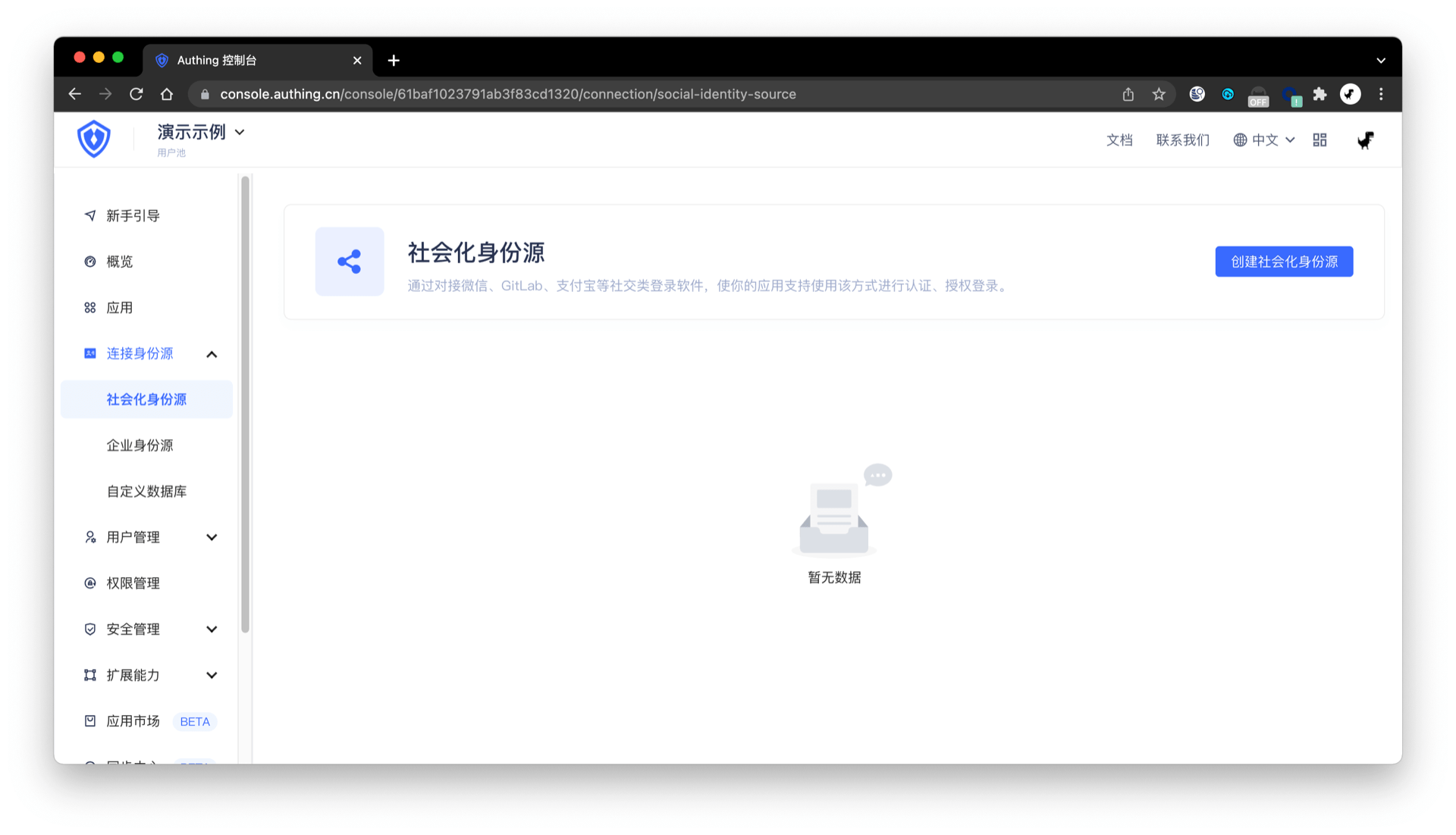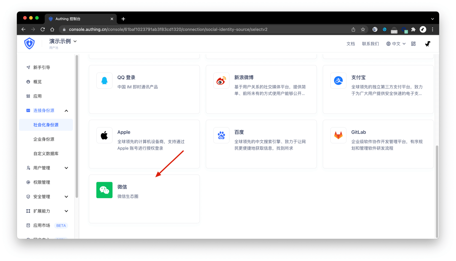最后在 GenAuth 控制台 连接身份源 -> 社会化登录 创建一个微信社会化身份源: